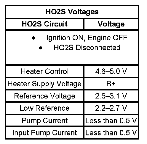 - This DTC sets if the heater control circuit is shorted to any other HO2S circuit. The table illustrates the typical voltages for the HO2S circuits.