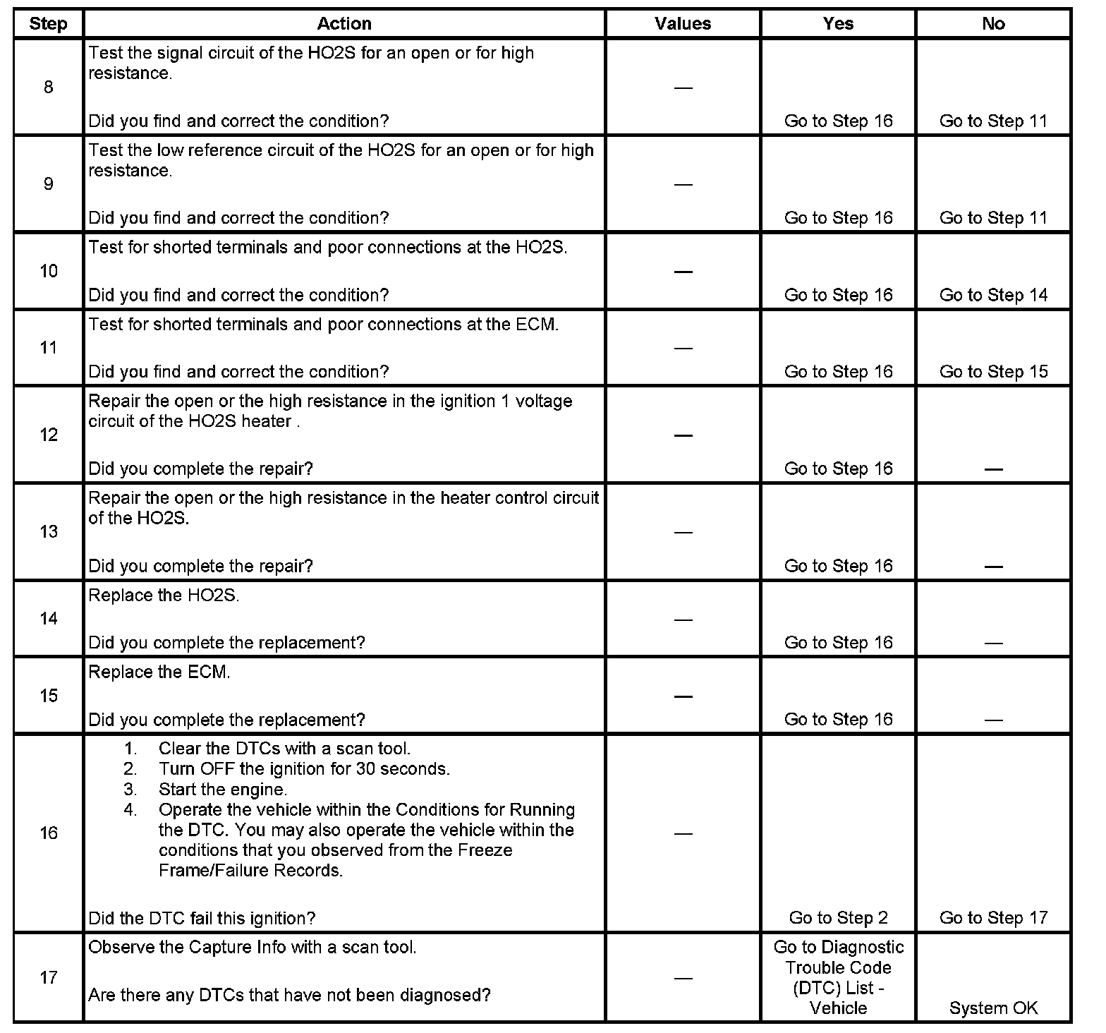 - DTCs P0137, P0138, P0140, P0157, P0158, or P0160 are not set.
