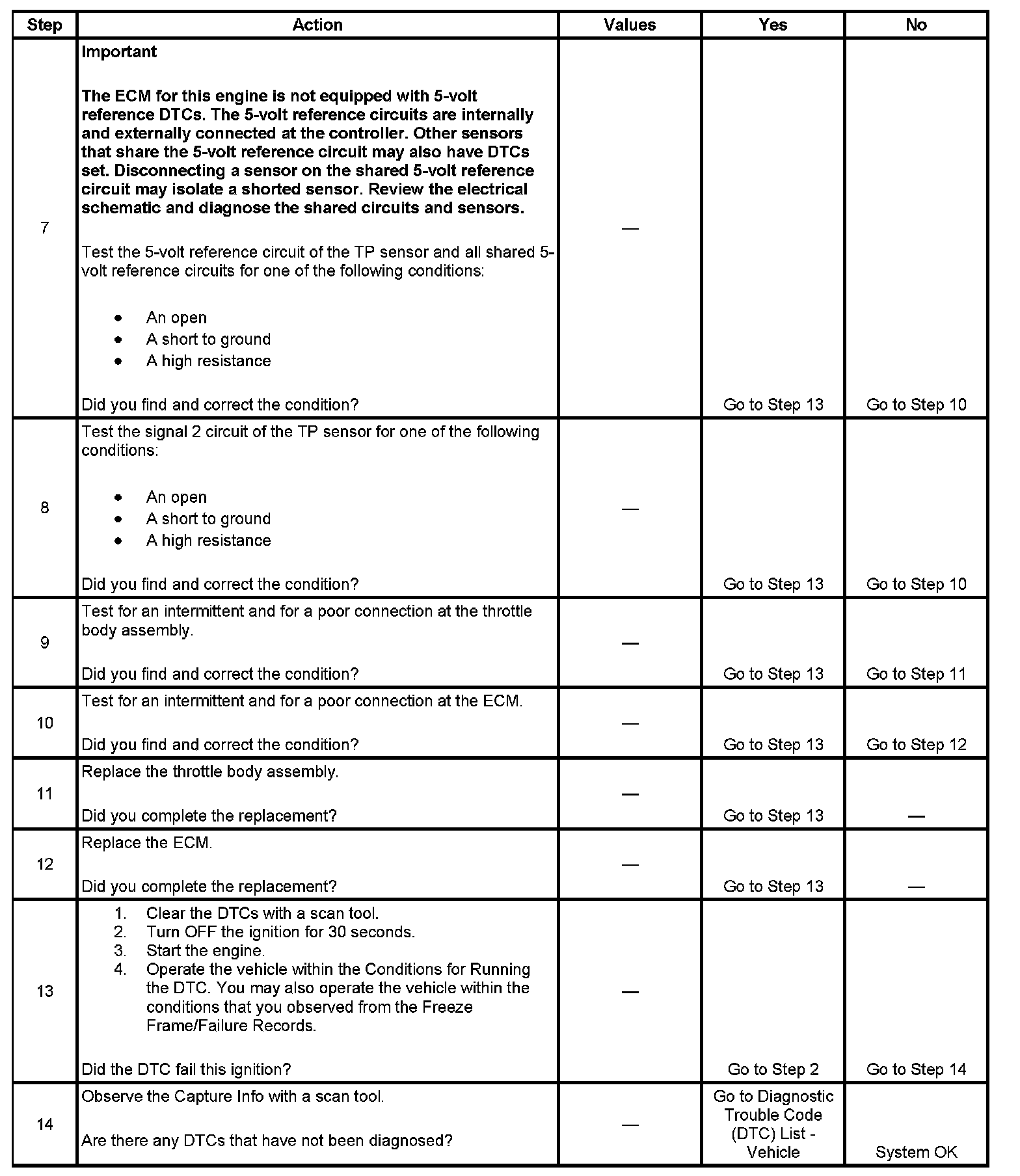 6. This step tests the signal 2 circuit of the TP sensor. If the TP sensor 2 voltage parameter is not 4.8-5.2 volts, test for a condition in the signal 2 circuit.