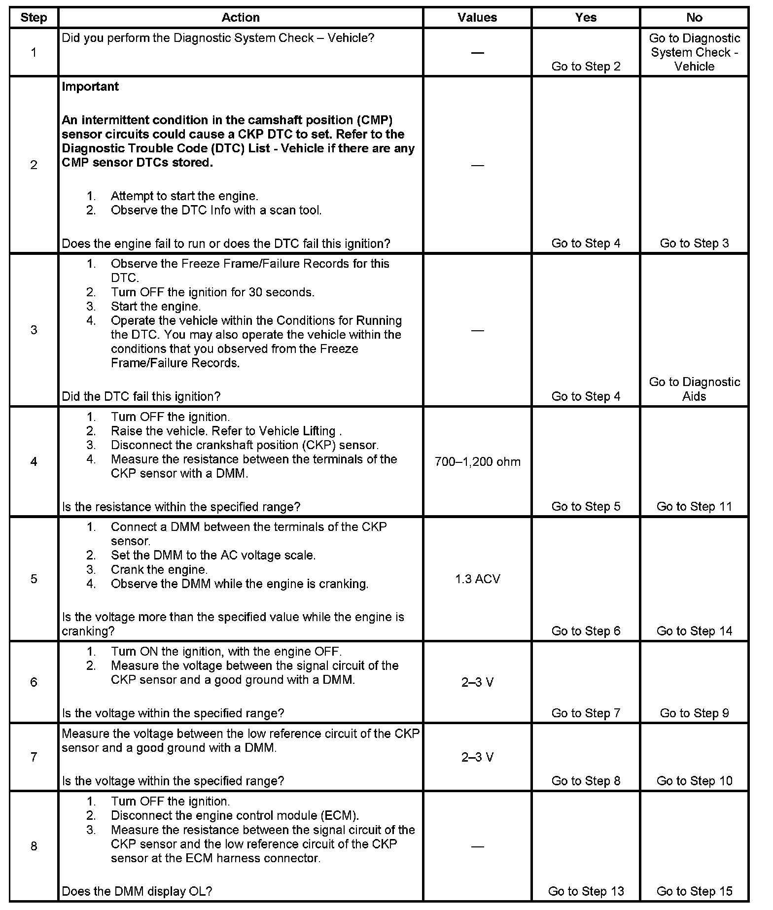 8. This step is testing if the signal circuit and the low reference circuits of the CKP sensor are shorted together. If the DMM displays continuity, the circuits are shorted together.