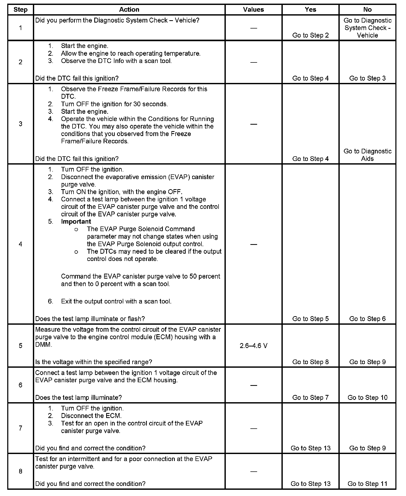- The ECM detects the voltage on the EVAP canister purge valve control circuit is between 2.6-4.6 volts when the driver is commanded OFF.