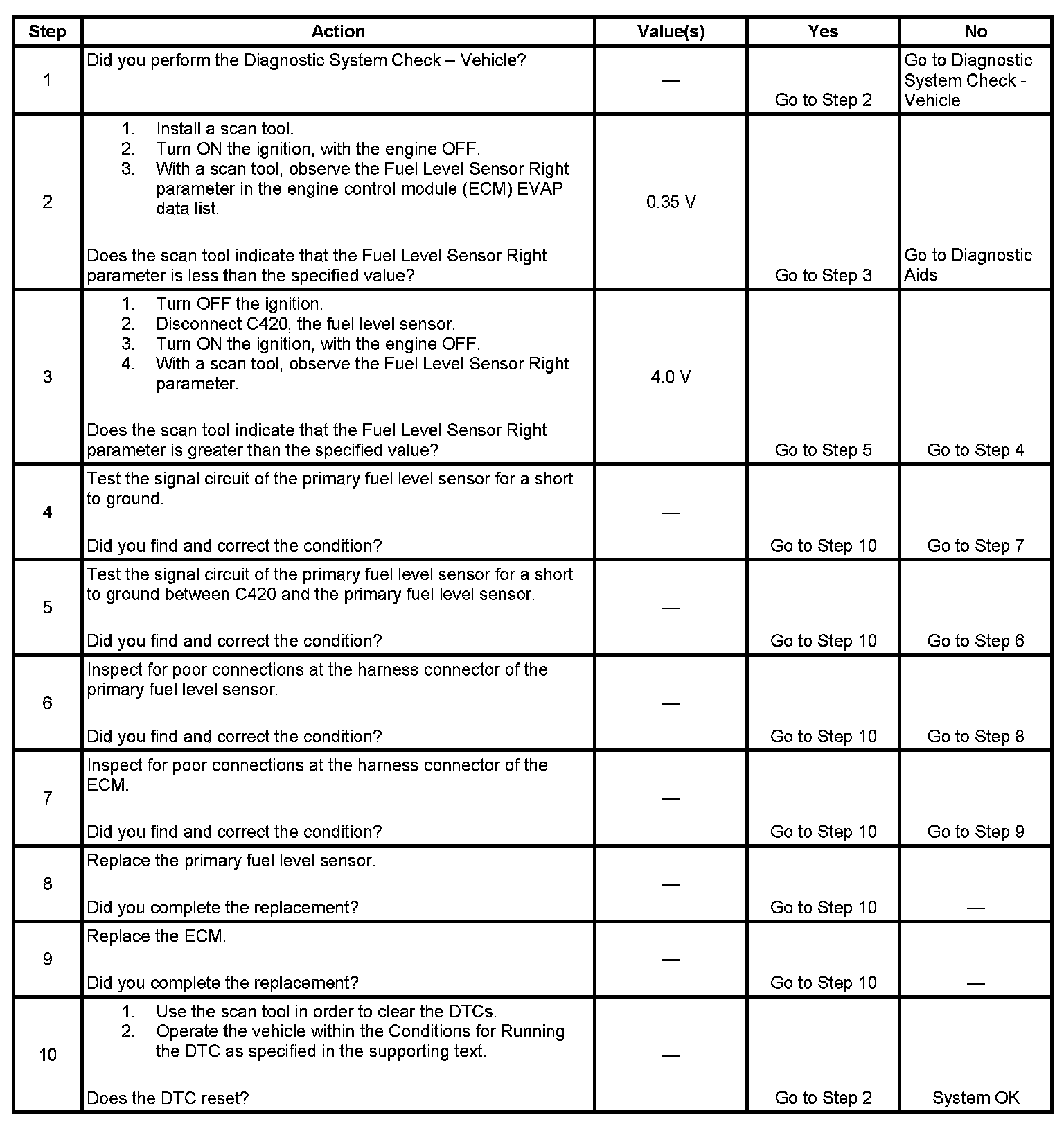 The primary fuel level sender and the secondary fuel level sender change resistance in response to fuel level. The engine control module (ECM) monitors the signal circuit of the primary fuel level sender and the secondary fuel level sender in order to determine the fuel level. When the fuel tanks are full, the resistances of both fuel level senders are high, and the ECM senses a high signal voltage on both the signal circuit of the primary fuel level sender and the signal circuit of the secondary fuel level sender. When the fuel tanks are empty, the resistances of the fuel level senders are low, and the ECM senses a low signal voltage. The ECM uses the signal circuits of the primary fuel level sender and the secondary fuel level sender in order to calculate the percentage of remaining fuel in the tanks. The ECM sends the fuel level percentage via the class 2 serial data circuit to the instrument cluster in order to control the fuel gage. The fuel level information is also used for misfire and evaporative emission (EVAP) diagnostics. This diagnostic tests for a lower than normal primary fuel level sender signal.