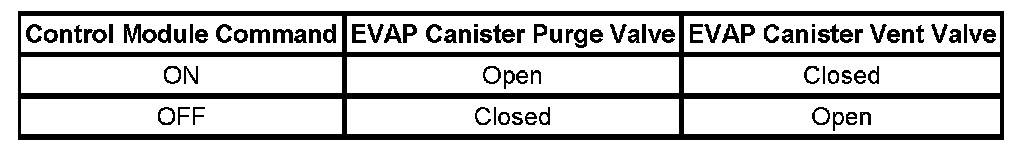 The table illustrates the relationship between the ON and OFF states, and the Open or Closed states of the EVAP canister purge and vent valves.