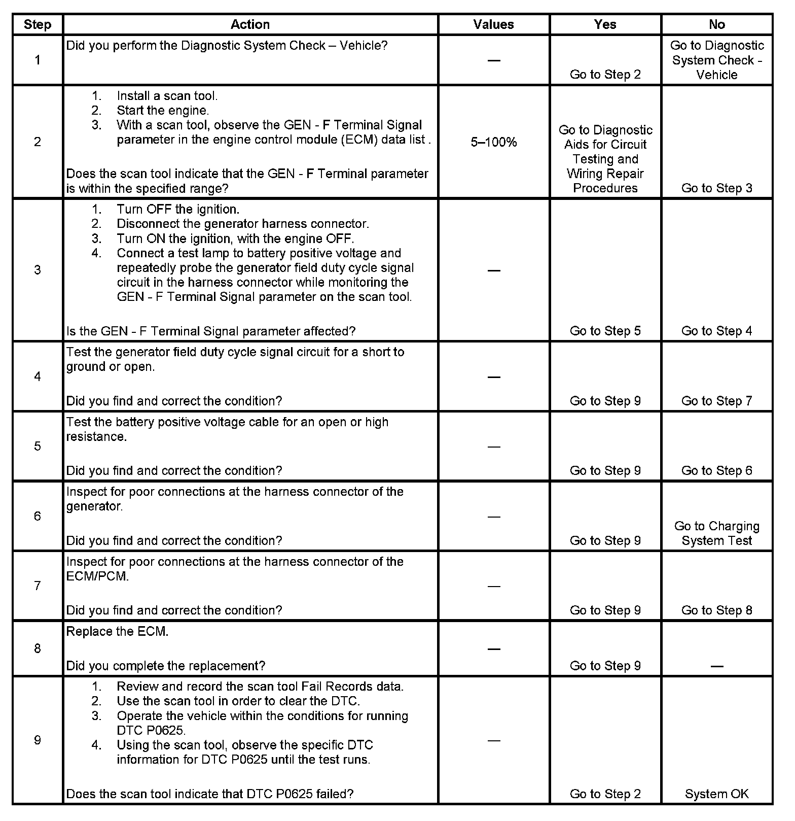 The ECM monitors the state of the generator field duty cycle signal circuit. When the engine is running, the ECM should detect a duty cycle that varies up to 100 percent. The ECM monitors the PWM signal using a key ON test and a RUN test. During the tests, if the ECM detects an out of range PWM signal, a DTC will set. When the DTC sets, the ECM will send a class 2 serial data message to the instrument panel cluster (IPC) and DIC to illuminate the charge indicator or display a charging message.