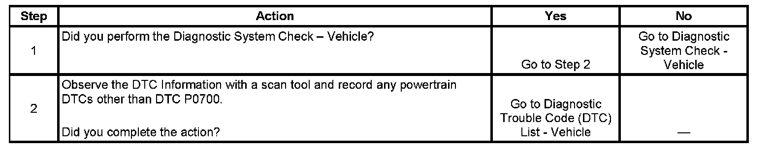 This diagnostic trouble code (DTC) indicates that an emission related transmission DTC set in the transmission control module (TCM). The engine control module (ECM) receives the TCM information over the serial data circuit. The ECM turns ON the malfunction indicator lamp (MIL) when the TCM sends a message over the serial data circuit requesting MIL illumination. The DTC information for the ECM will only display DTC P0700.
