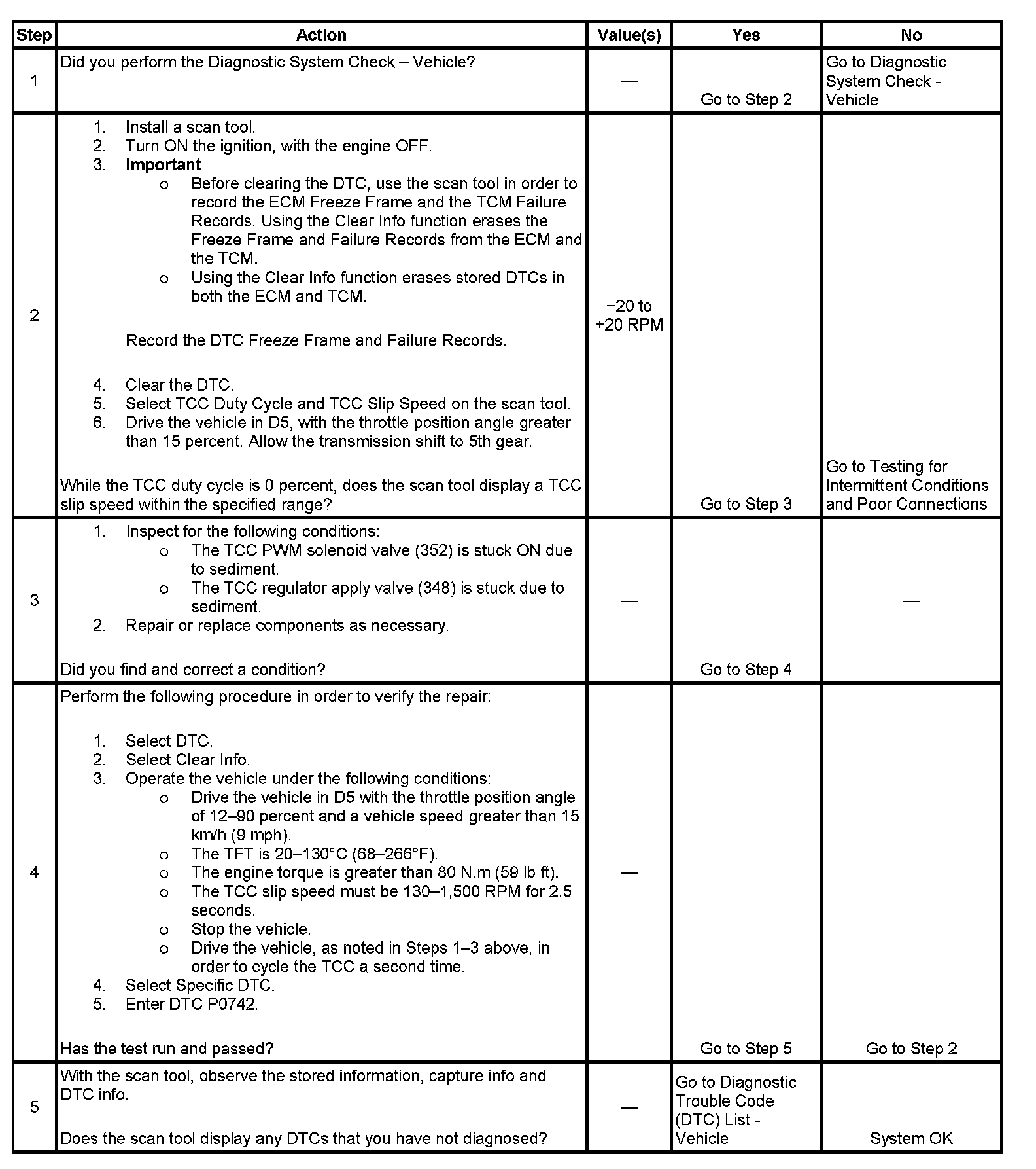 2. This step verifies that the PCM commanded the TCC PWM solenoid valve OFF and the slip speed is -20 to +150 RPM.