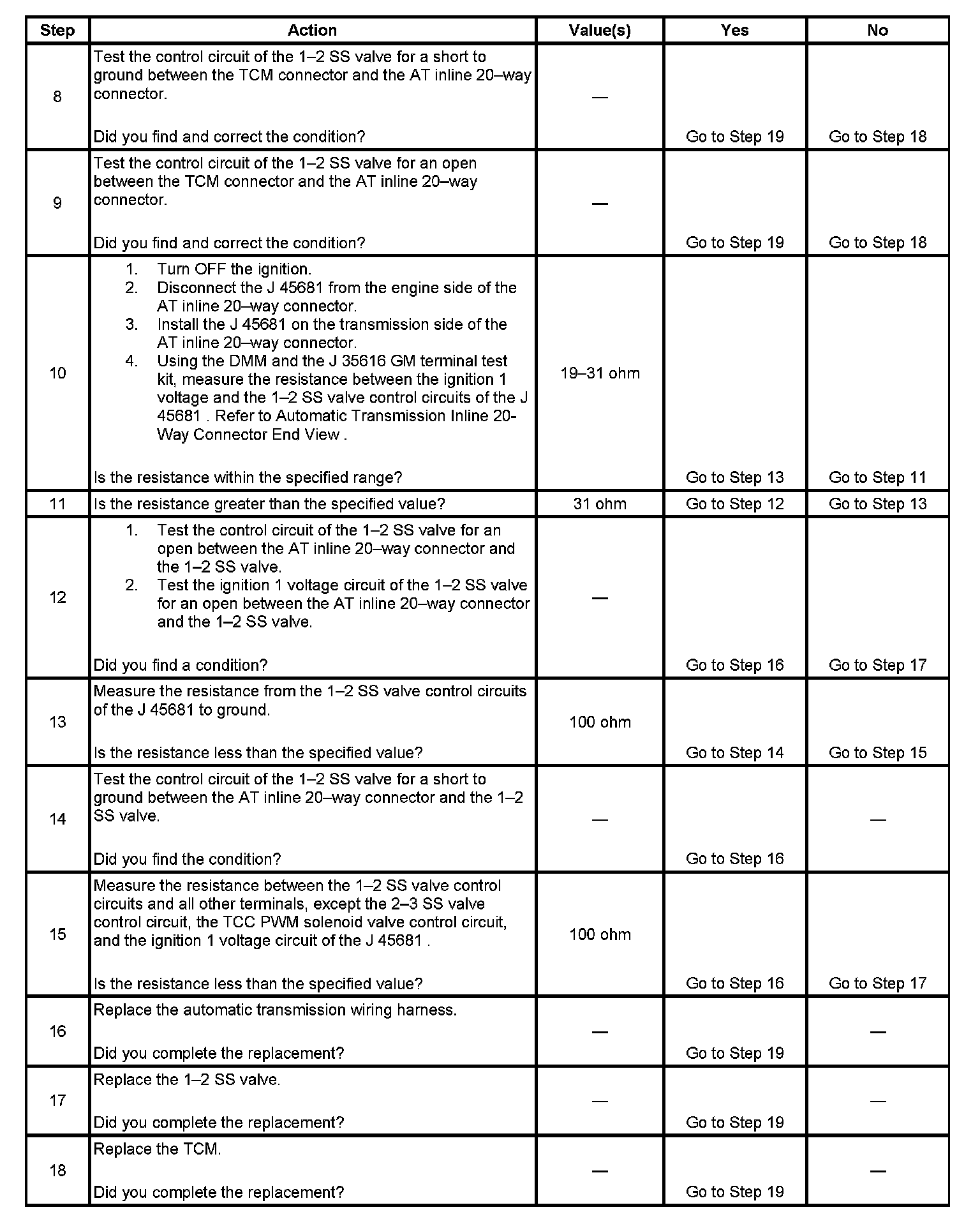 The TCM provides voltage to the solenoid through High Side Driver 2 (HSD2). The TCM uses a second driver to control the solenoid ground circuit. The controlled ground driver reports feedback voltage to the TCM. When the TCM commands the 1-2 shift solenoid valve ON, the voltage of the control circuit should be approximately 0 volts. When the TCM commands the 1-2 shift solenoid valve OFF, the voltage of the control circuit should be approximately system voltage.