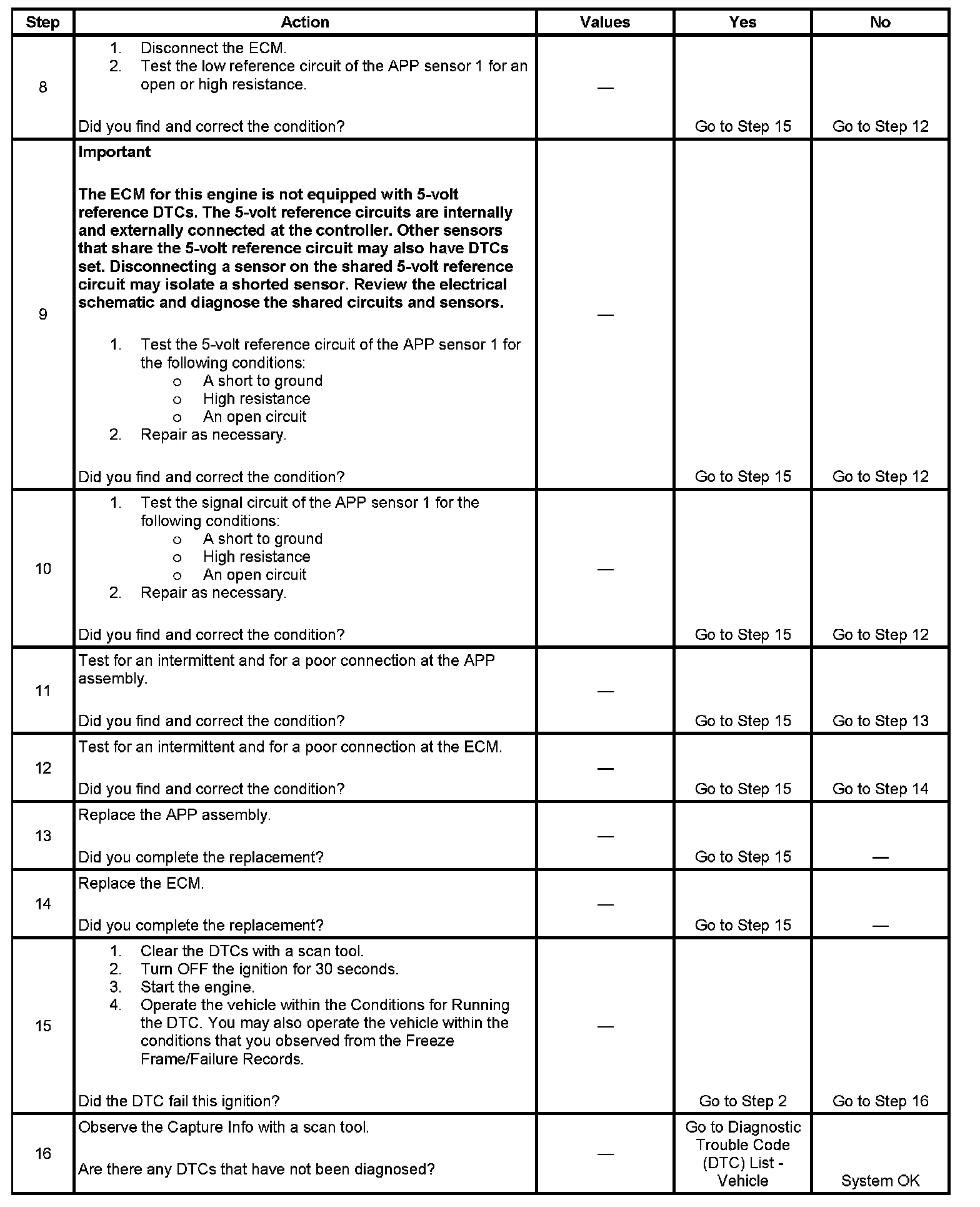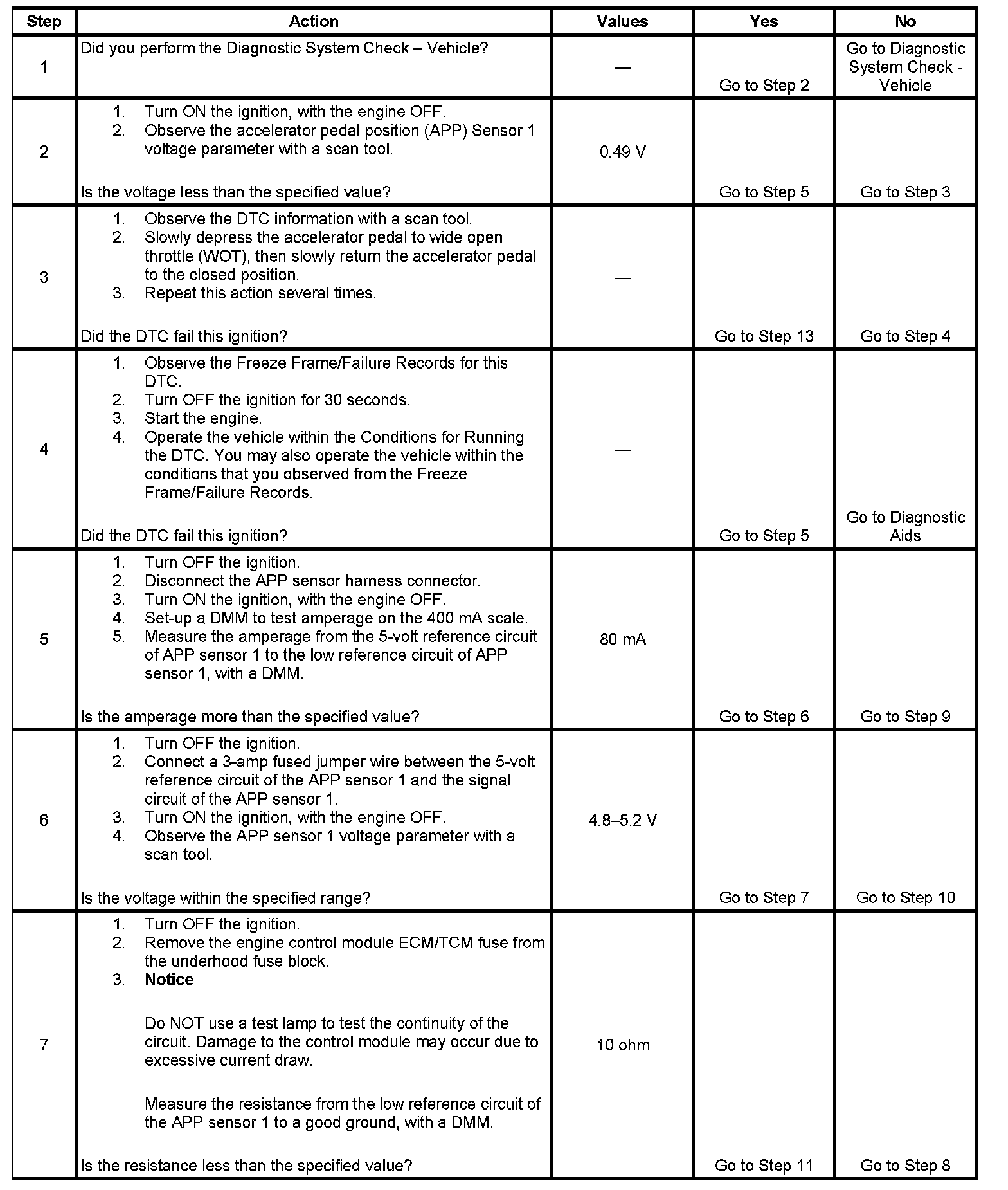 3. This step tests the internal circuits of the APP sensor 1 throughout its range of motion. If this DTC sets when slowly moving the pedal from the rest position to wide open throttle (WOT), replace the APP assembly for an internal fault.
