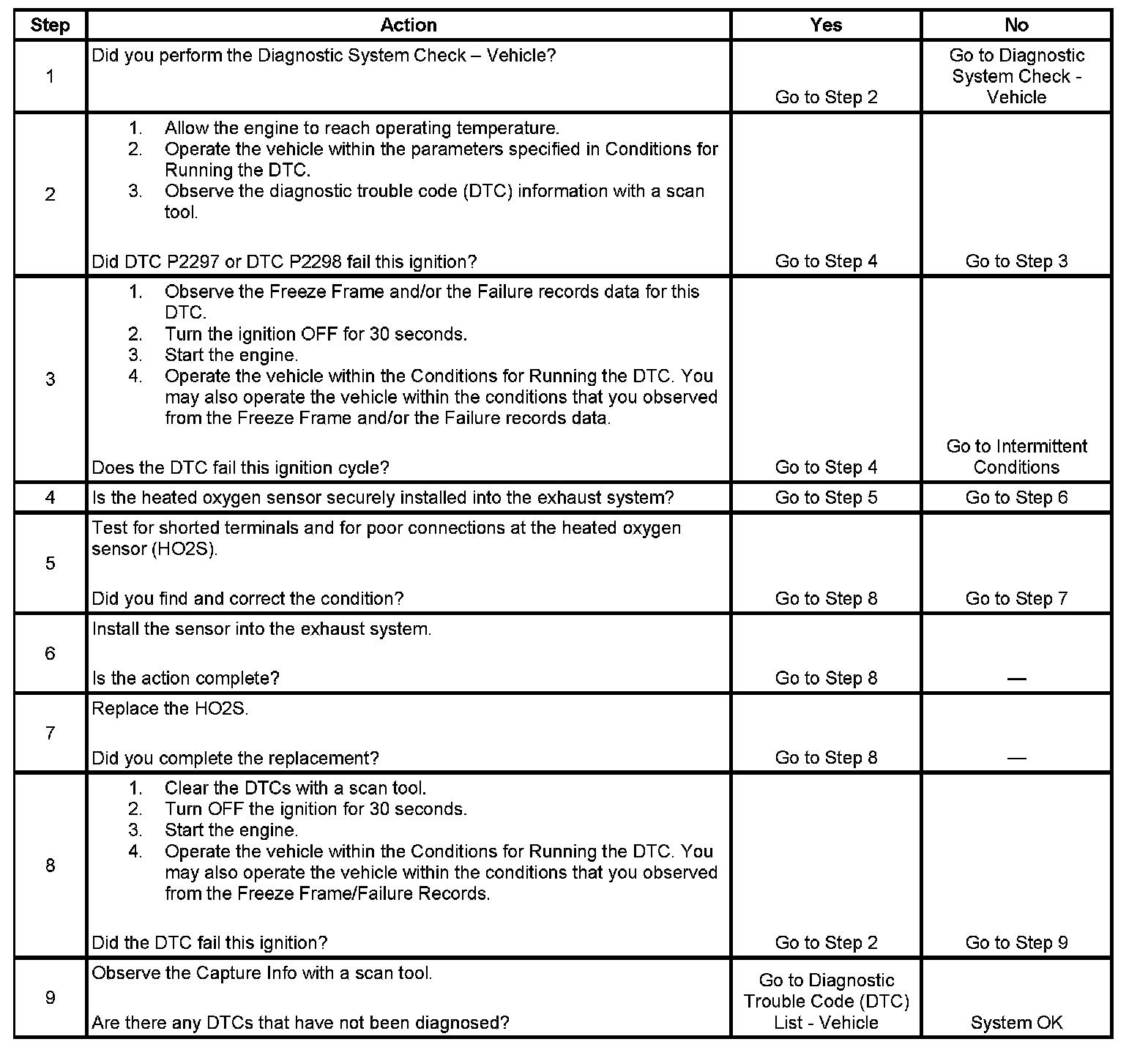 - Before the ECM can report DTC P2297 or P2298 failed, DTCs P0030, P0031, P0050, P0051, P0052, P0130, P0131, P0132, P0150, P0151, P0152, P2237, P2240, P2243, P2247, P2251, and P2254 must run and pass.