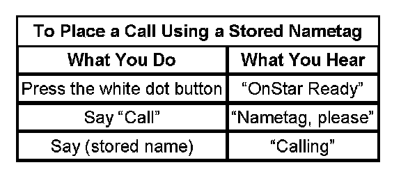 Customers have the ability to store telephone numbers within the module, referenced by a nametag for the convenience of frequently dialed numbers. This process is initiated by pressing the answer/end call button, waiting for the system response, then speaking the response "store". The system will respond with "number please" at which time the user should enter the number desired to be stored. Once complete, saying the word "store" again lets the system know you are finished entering the number. At this time, the system will elicit the user to assign a nametag to that number. From this point forward, the user can dial this number by initiating the OnStar(R) personal calling (OPC) feature, speaking the word "call," and repeating the nametag assigned. To delete a nametag, the user should initiate OPC, say "delete" then speak the nametag to be removed. In the event a nametag cannot be deleted in spite of repeated attempts from several speakers, the OnStar(R) module will require replacement.