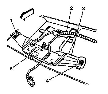 3. Position the overhead console bracket (3) to the sunshade rod retainer.