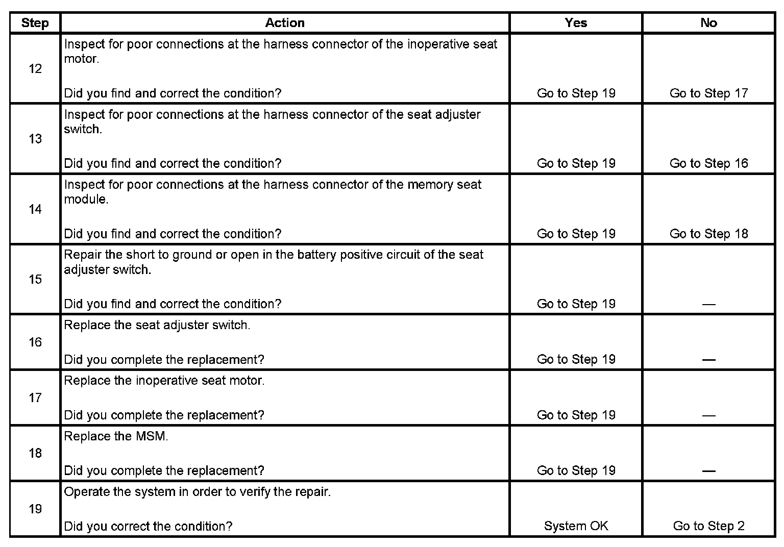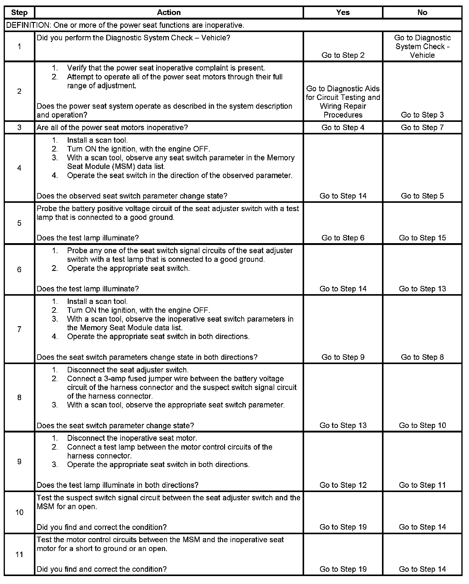 8. This step tests the integrity of the signal circuits of the seat adjuster switch. If the fuse in the jumper wire opens when you perform this test, a short to ground may have occurred.