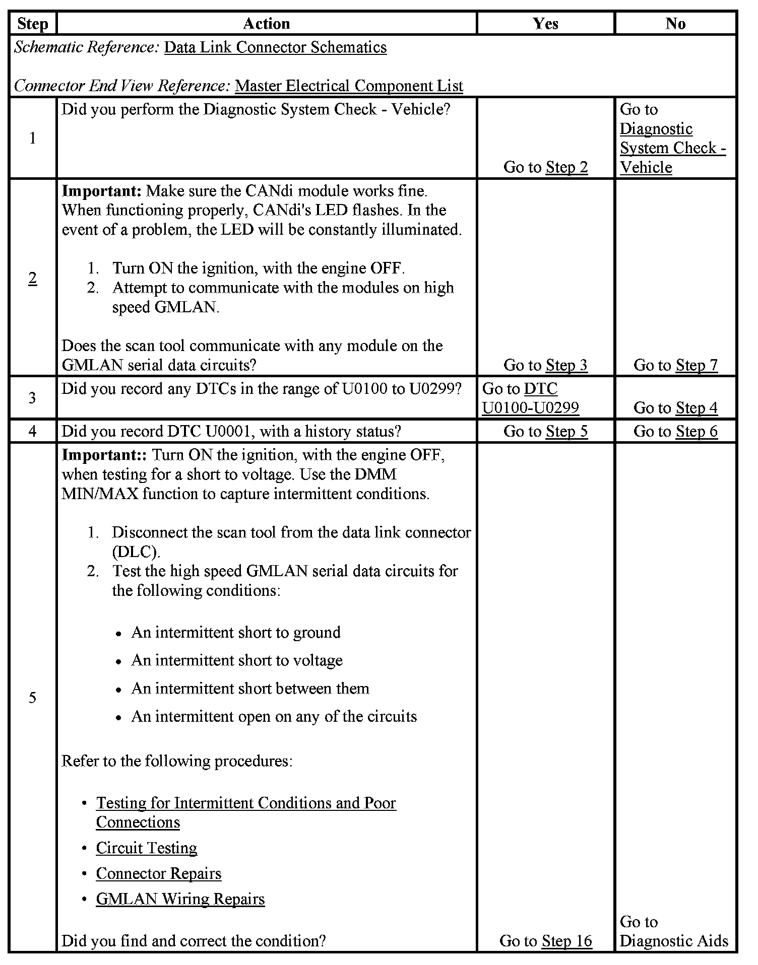 Modules connected to the high speed GMLAN serial data circuits monitor for serial data communications on the high speed GMLAN network during normal vehicle operation. Operating information and commands are exchanged among the modules. When a module detects a bus-off condition, a DTC U0001 will be set. This DTCs can be retrieved as history only.