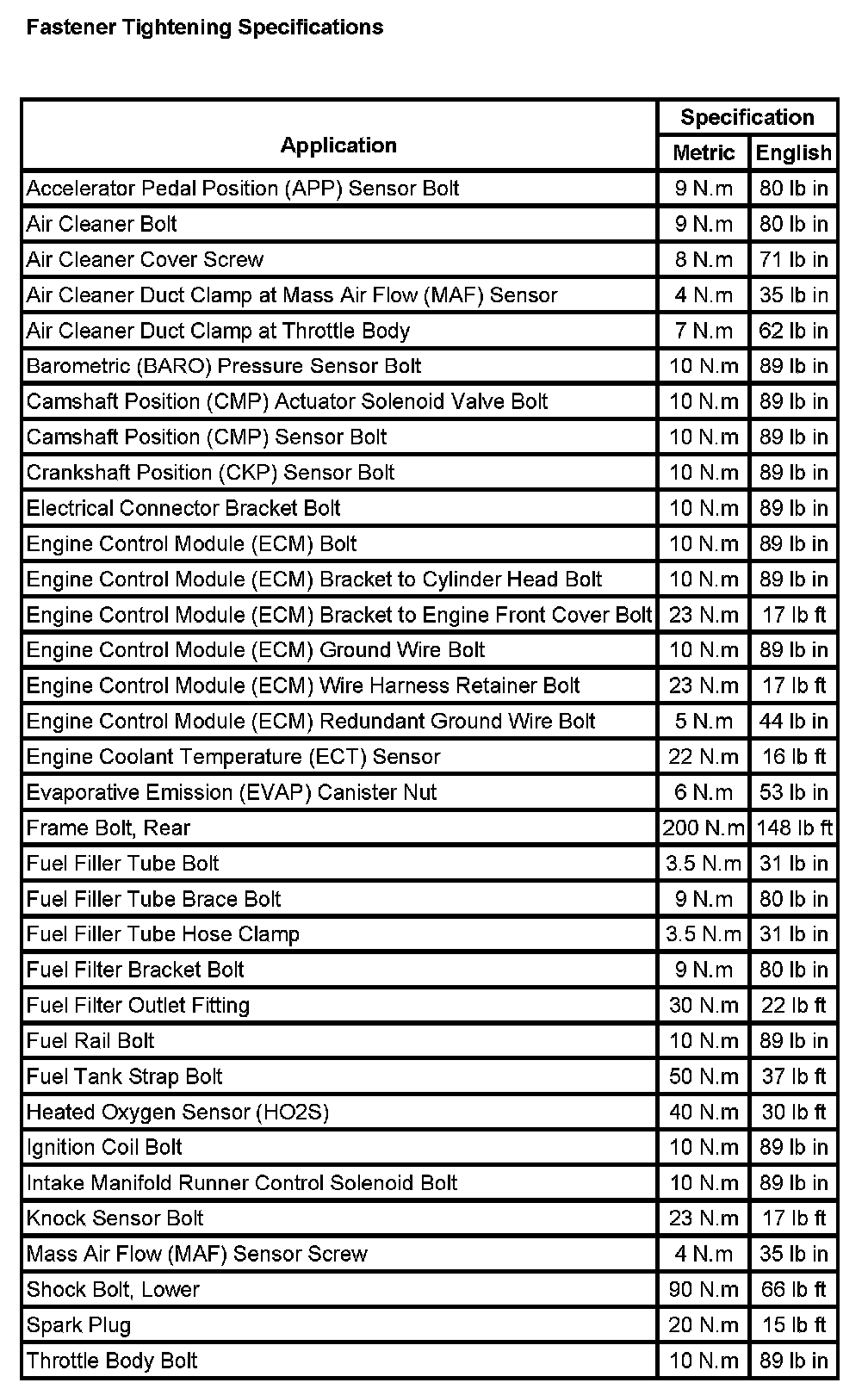 Fastener Tightening Specifications: