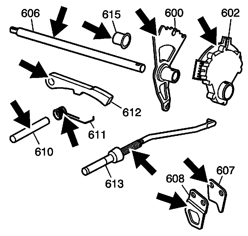 ^ A worn or damaged park pawl shaft (610), park pawl spring (611), and park pawl (612)