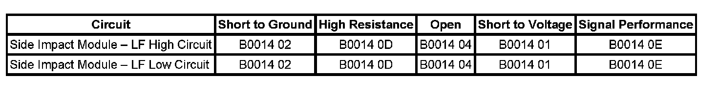 - If DTC B0014 is current, replace the side impact module - LF wiring harness.