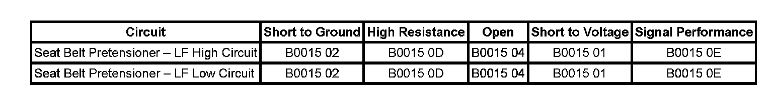 The seat belt pretensioner - LF high and/or low circuit is short to voltage for 120 milliseconds.