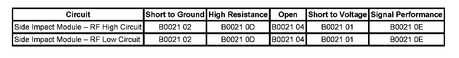 - Test and repair both side impact module - RF high and low circuits for a short to voltage, short to ground, or open/low resistance. If all circuits test normal, replace the SDM.
