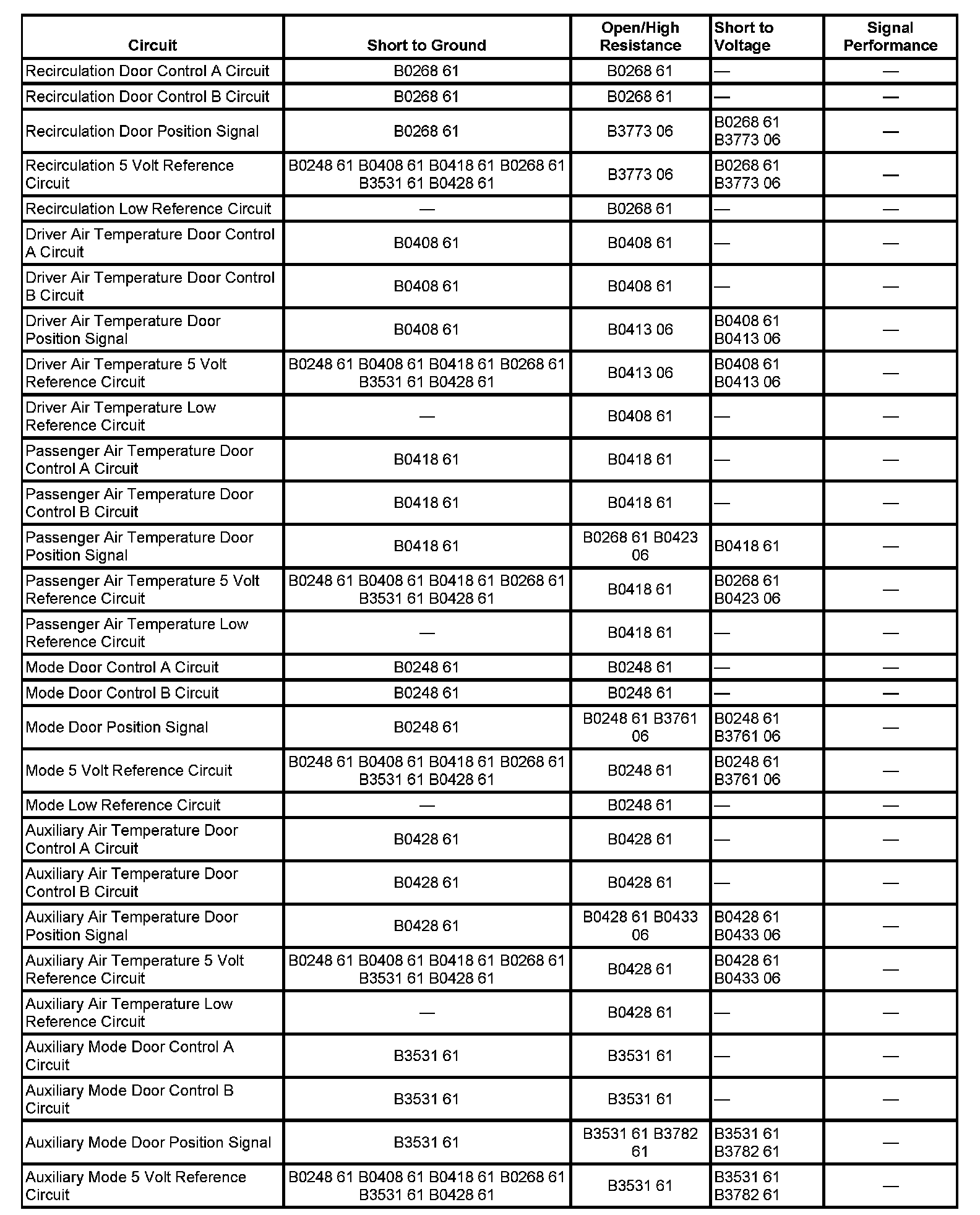 The actual door position differs from the commanded door position by more than 4 counts or the HVAC control module detects the door position signal circuit is less than 7 counts or greater than 250 counts.