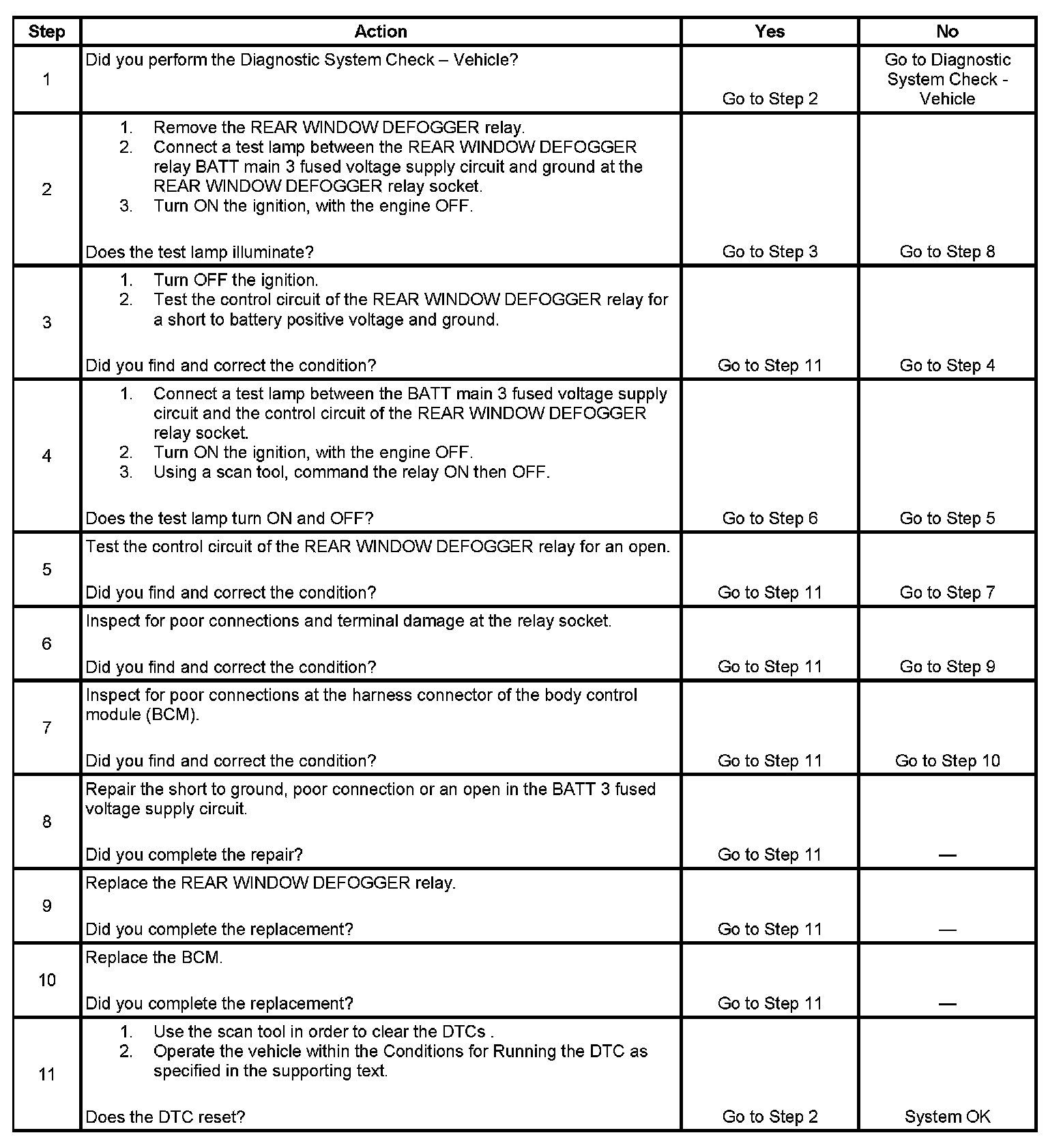- The BCM detects that the REAR WINDOW DEFOGGER relay control circuit is open.
