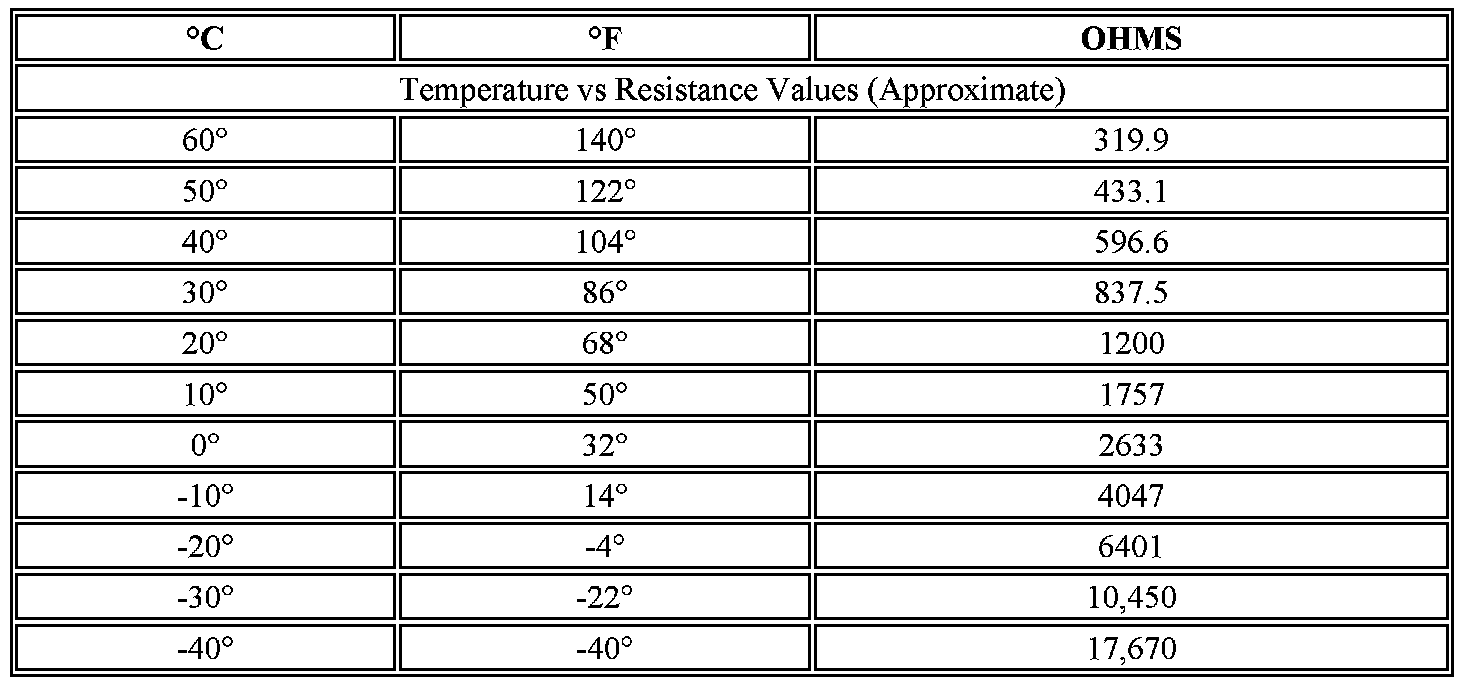 Important: If the resistance is measured with the seat still warm or cool, the resistance values will vary. At 68°F (20°C), the nominal resistance value is 1200 ohms ±5 percent. For hotter or colder ambient temperatures, refer to the Temperature vs Resistance table below. The delta resistance values between the seat cushion and seat back temperature sensors should not be greater than 2000 ohms.