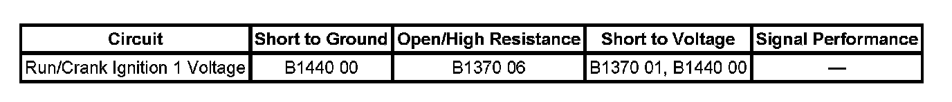 When the ignition switch is placed in the RUN or CRANK position, the switch supplies B+ to the BCM run/crank ignition 1 voltage input terminal. If this circuit becomes shorted to B+, ground or the circuit opens, DTC B1370 will set.