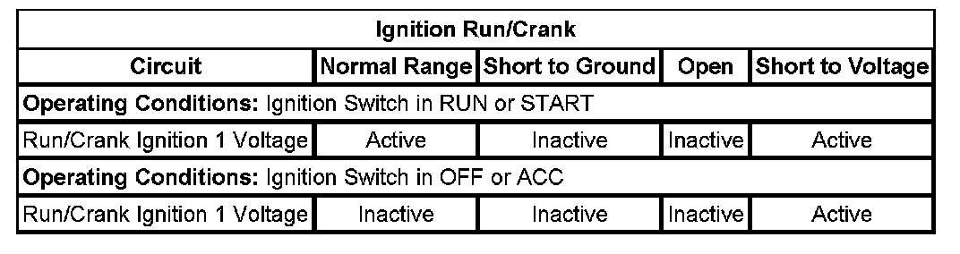 Run/crank Ignition 1 voltage circuit is shorted to voltage for more than 2 seconds.