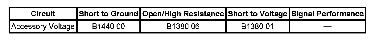 When the vehicle operator places the ignition switch in the ACC or RUN position, the switch supplies B+ to the BCM accessory voltage input terminal. If this circuit becomes shorted to B+, ground or the circuit opens, DTC B1380 will set.