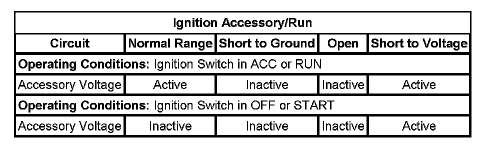 Using a scan tool monitor the Ignition Accessory/Run parameter while turning the ignition switch. Compare the parameter state with the typical scan tool data above.