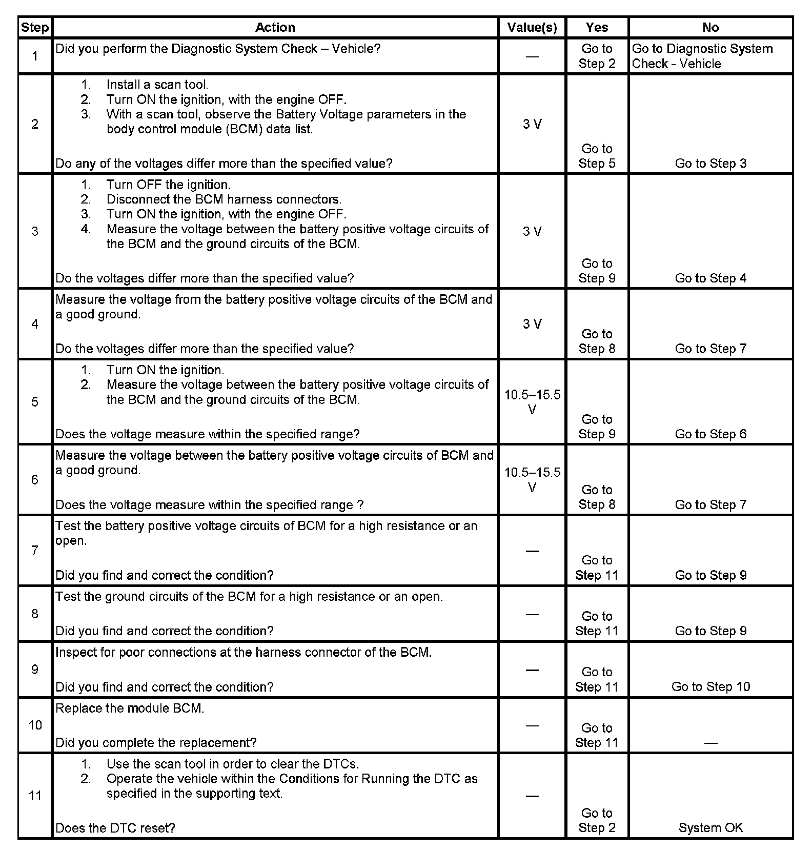 ^ The battery voltage differs by 3 volts on the BCM battery sense circuits for 15 seconds.