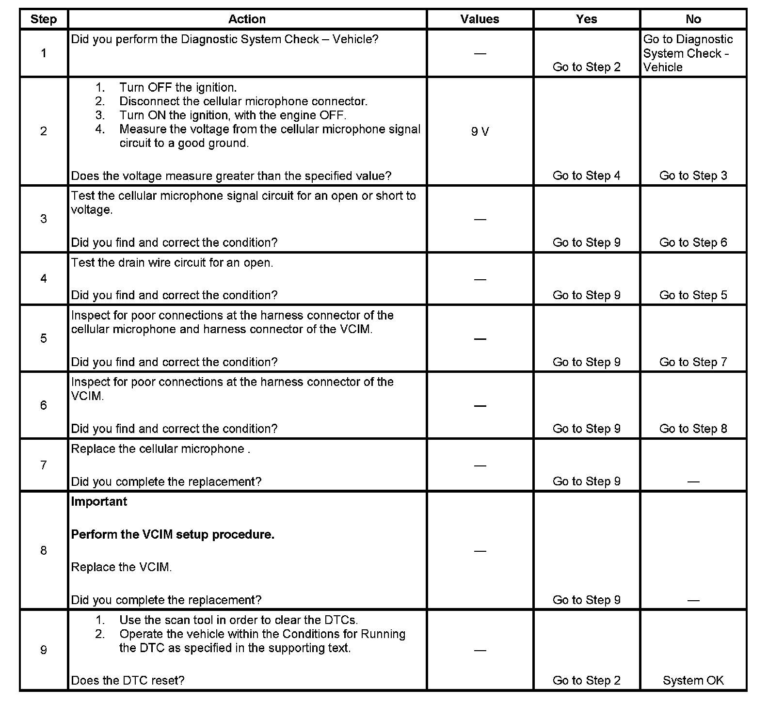 - The VCIM detects an open in the drain wire circuit or a short to voltage in the cellular microphone signal circuit.