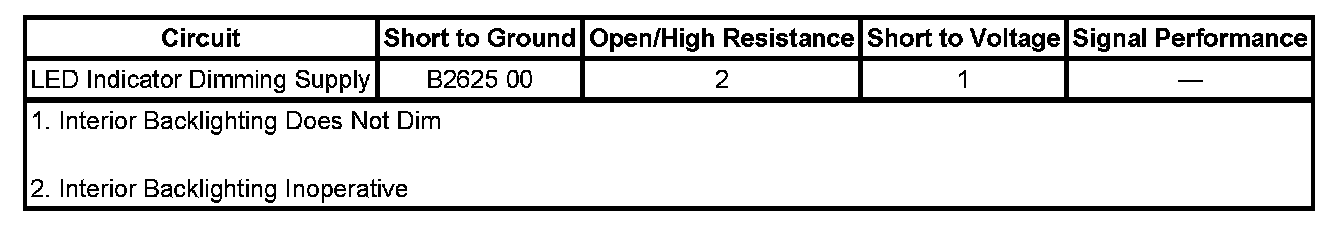 1. Disconnect all the LED indicator dimming supply circuit lamps related components. Verify DTC B2625 does not set.