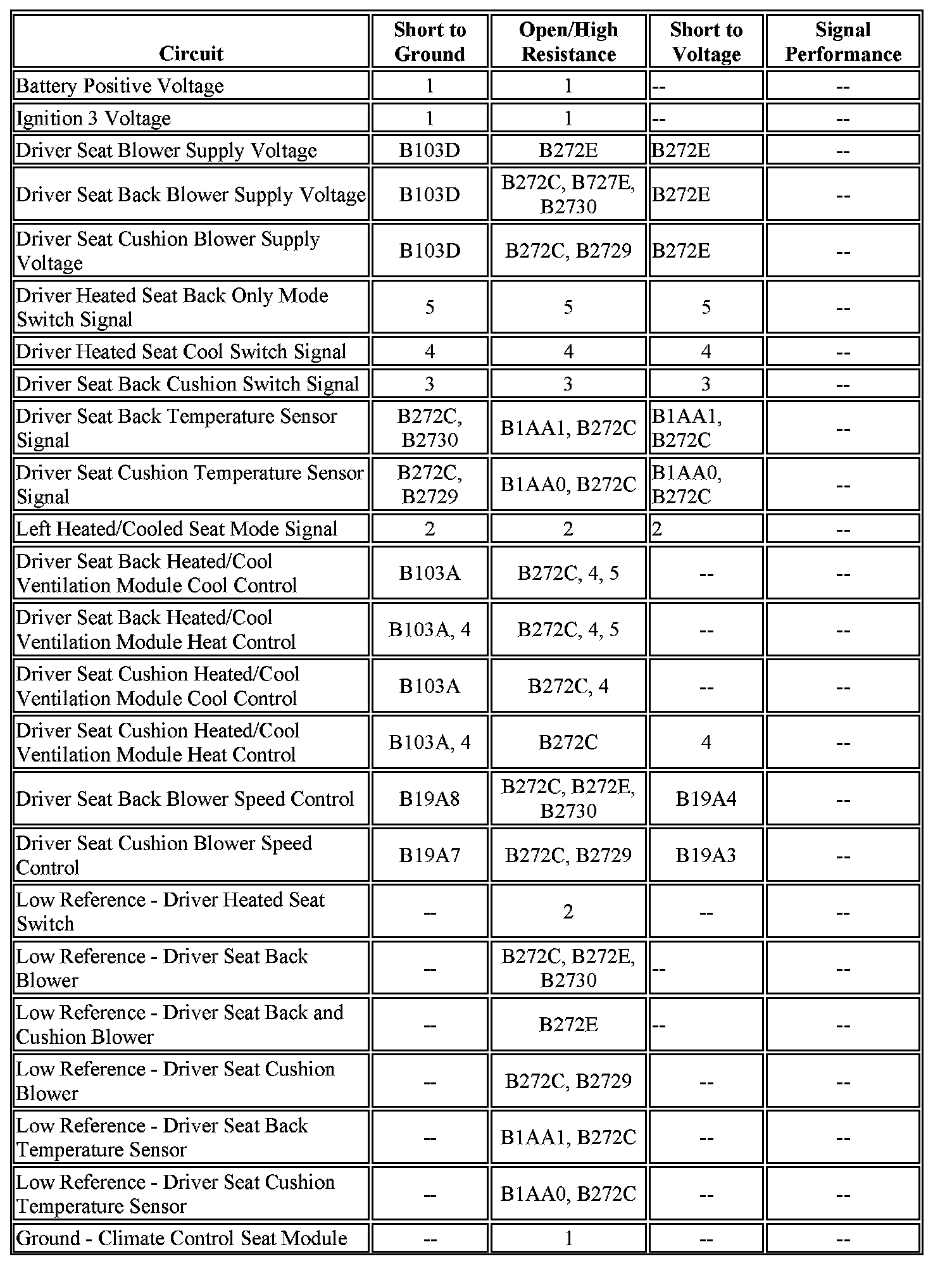 - The CCSM detects a short to ground on the driver seat back temperature sensor signal circuit for more than 4 seconds.