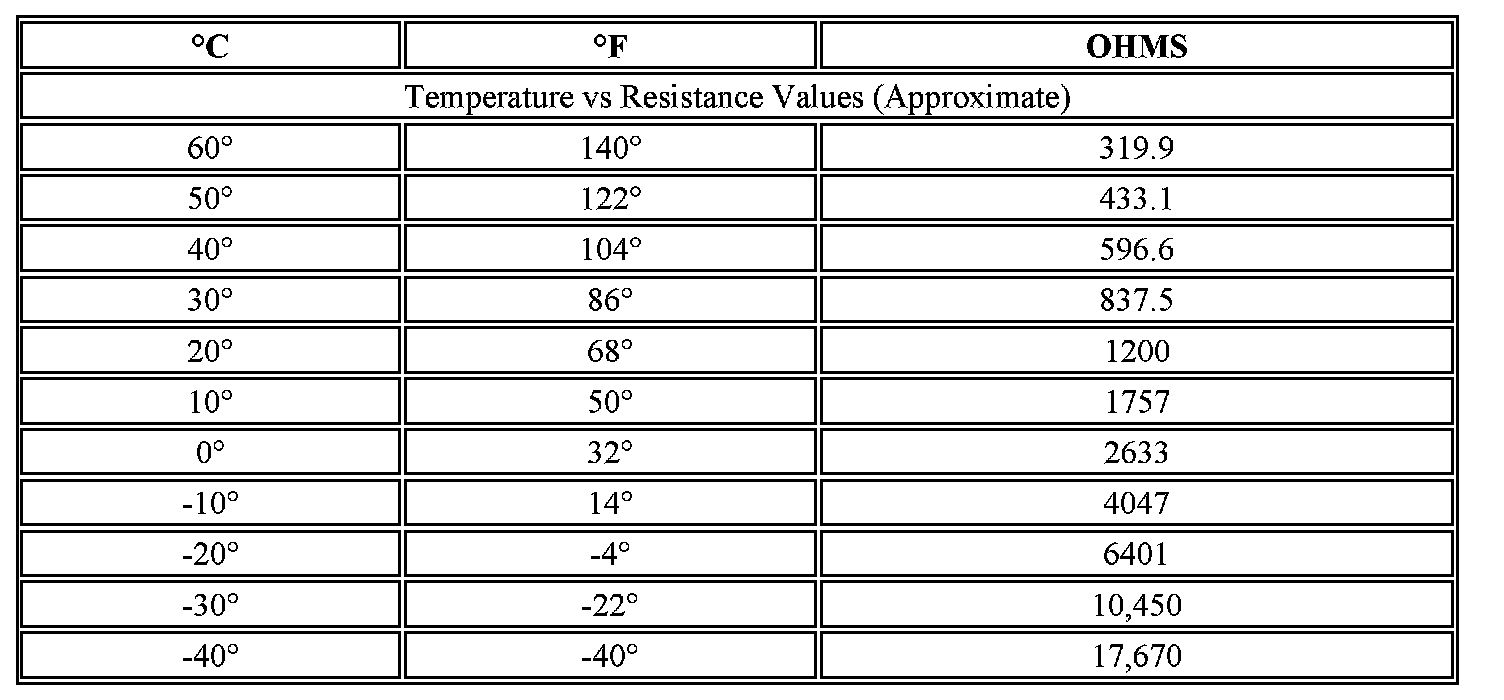 Important: If the resistance is measured with the seat still warm or cool, the resistance values will vary. At 68°F (20°C), the nominal resistance value is 1200 ohms ±5 percent. For hotter or colder ambient temperatures, refer to the Temperature vs Resistance table below. The delta resistance values between the seat cushion and seat back temperature sensors should not be greater than 2000 ohms.
