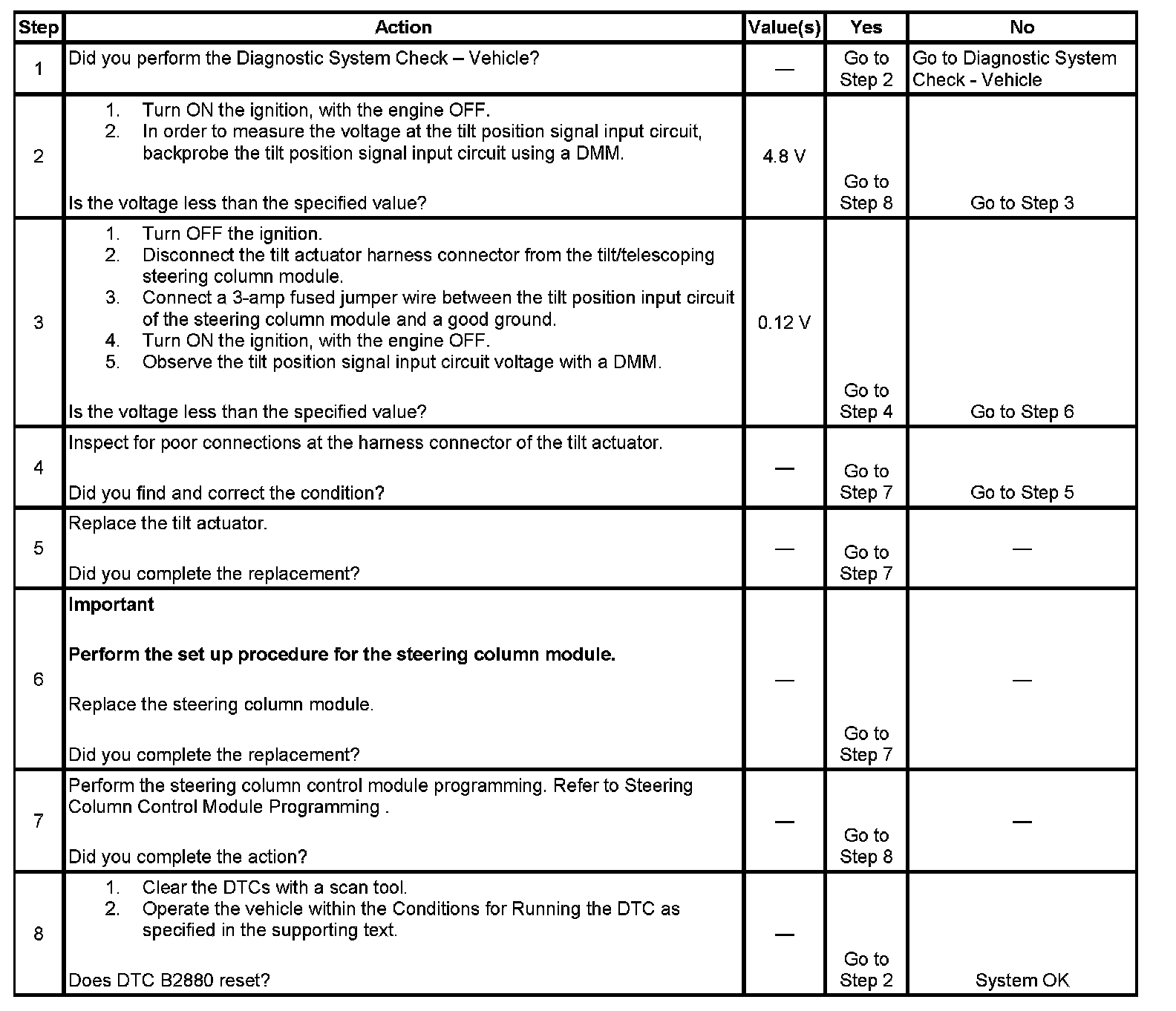 This DTC will set as current when the voltage is greater than 4.8 volts for 2 seconds on the tilt actuator circuit.