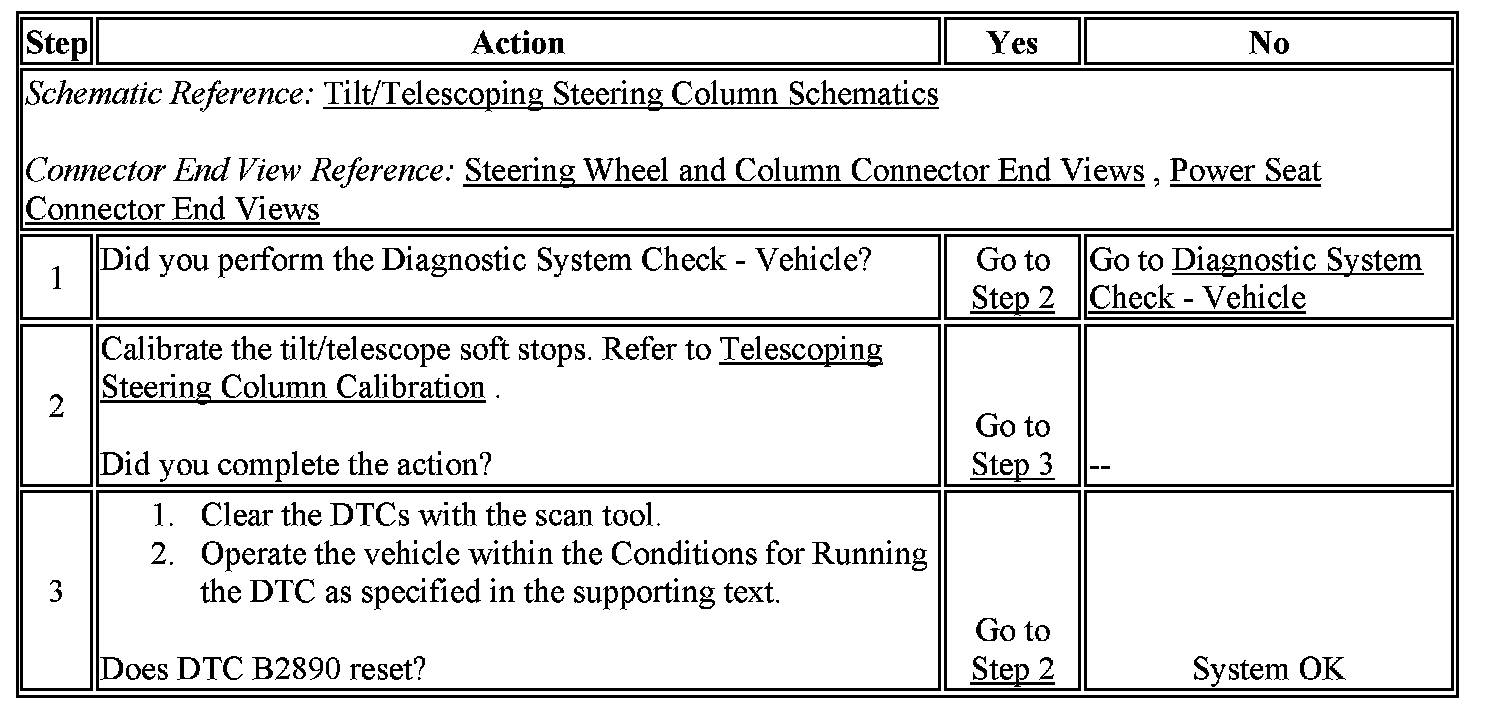 The driver position module (DPM) learns tilt/telescope soft stops approximately 1.3 cm (0.5 in) from the mechanical ends of travel. The system uses soft stops to prevent wear on the system by ensuring that the steering column movement stops before it reaches its mechanical end of travel in any direction. The soft stops are initially programmed at the factory. The stop positions may be reprogrammed, which is necessary any time the driver position module is replaced. If the soft stops have not been learned, DTC B2890 will set.