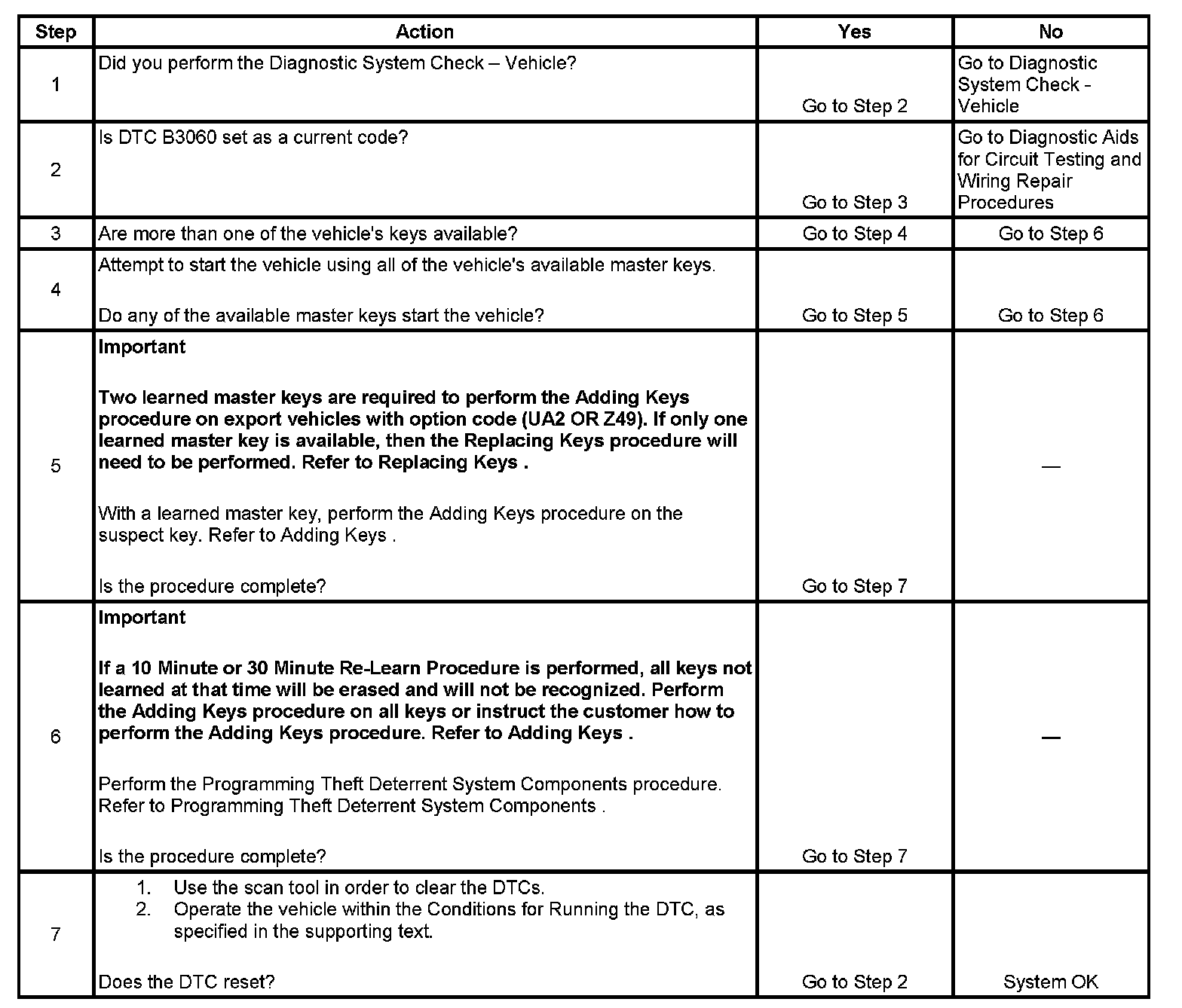 5. To set this DTC, a key with a working transponder that is not learned was read by the theft deterrent control module. For that key to operate the vehicle and one or more learned keys are available, perform the Adding Keys procedure.