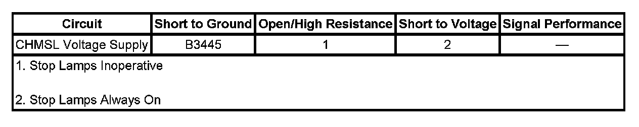 1. Disconnect the CHMSL assembly. Clear the DTC. Using a test lamp connected to the positive battery terminal, probe the CHMSL voltage supply circuit.