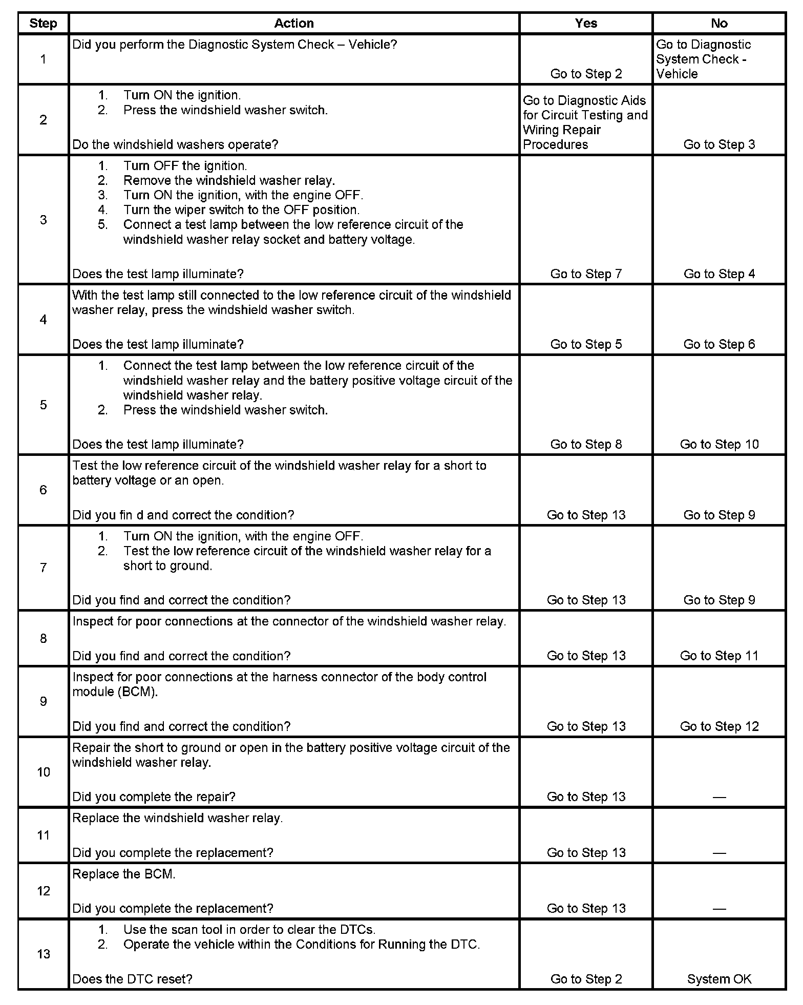 This DTC can set only when the BCM output to the windshield washer relay is active.