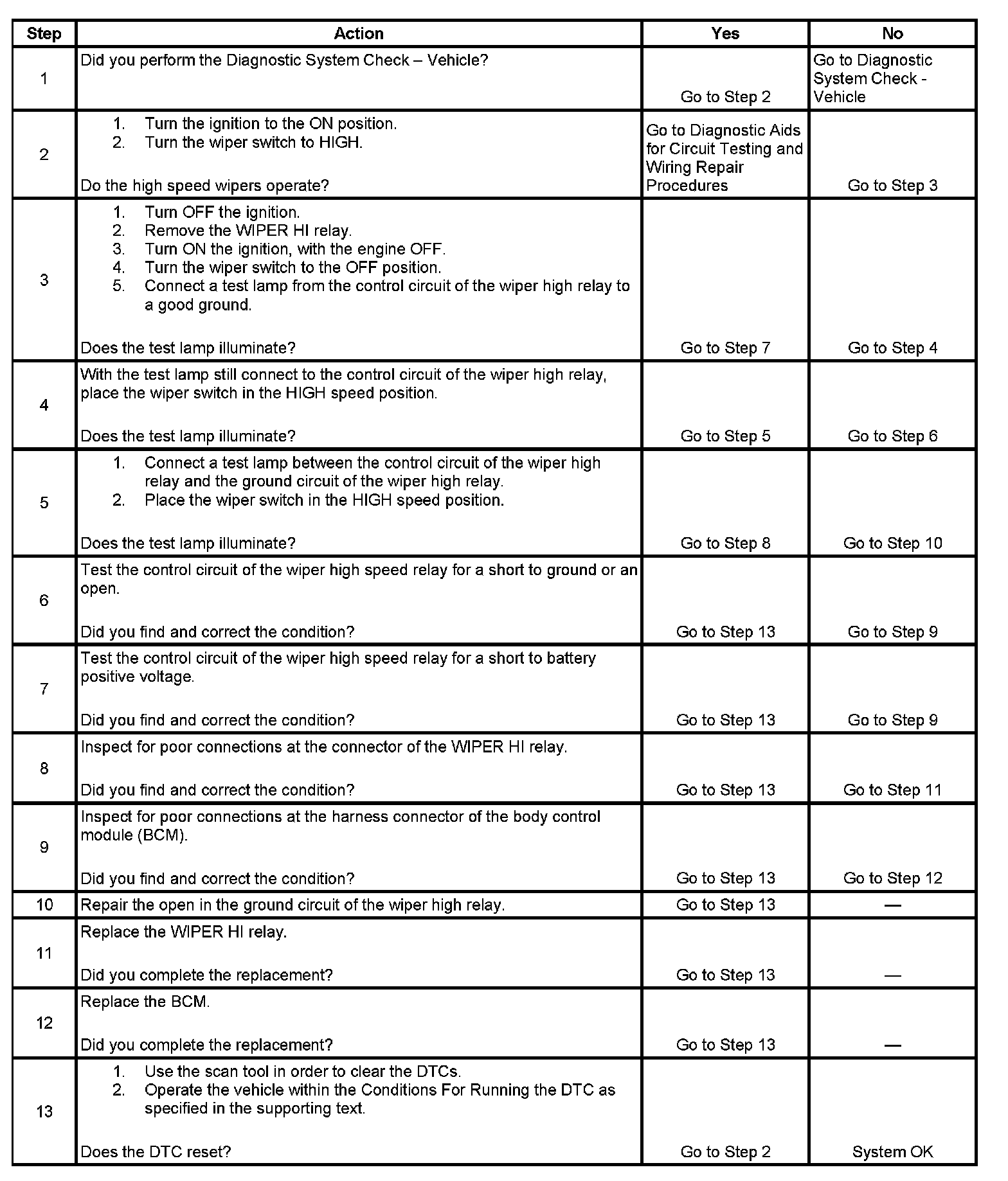 The BCM will set this DTC if it detects a short to ground or an open in the control circuit of the wiper high relay.