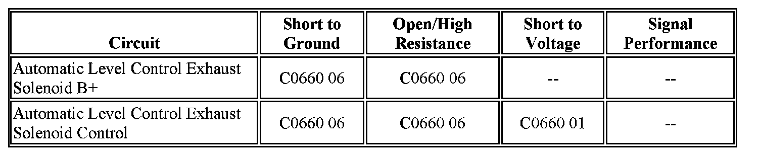 - C0660 06: Level Control Exhaust Circuit Short to Ground or Open Circuit.