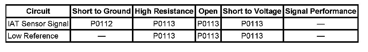 The IAT sensor is less than -39°C (-38°F) for more than 5 seconds.