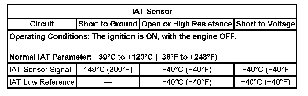 - If the IAT sensor parameter is more than 148°C (298°F), test the IAT sensor signal circuit for a short to ground or a faulty ECM.