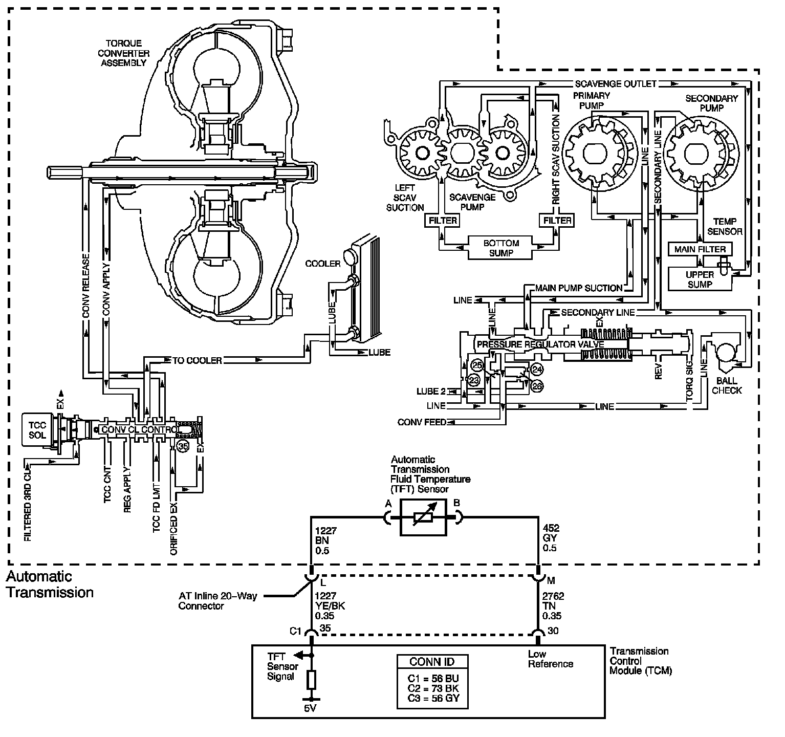 The automatic transmission fluid temperature (TFT) sensor is a negative coefficient thermistor. When the transmission fluid is cold, the sensor resistance is high. As the transmission fluid warms up, the sensor resistance becomes lower. The transmission control module (TCM) uses TFT information to control torque converter clutch apply and release, line pressure, and shift time. The TFT range is from -40 to +151°C (-40 to +305°F).