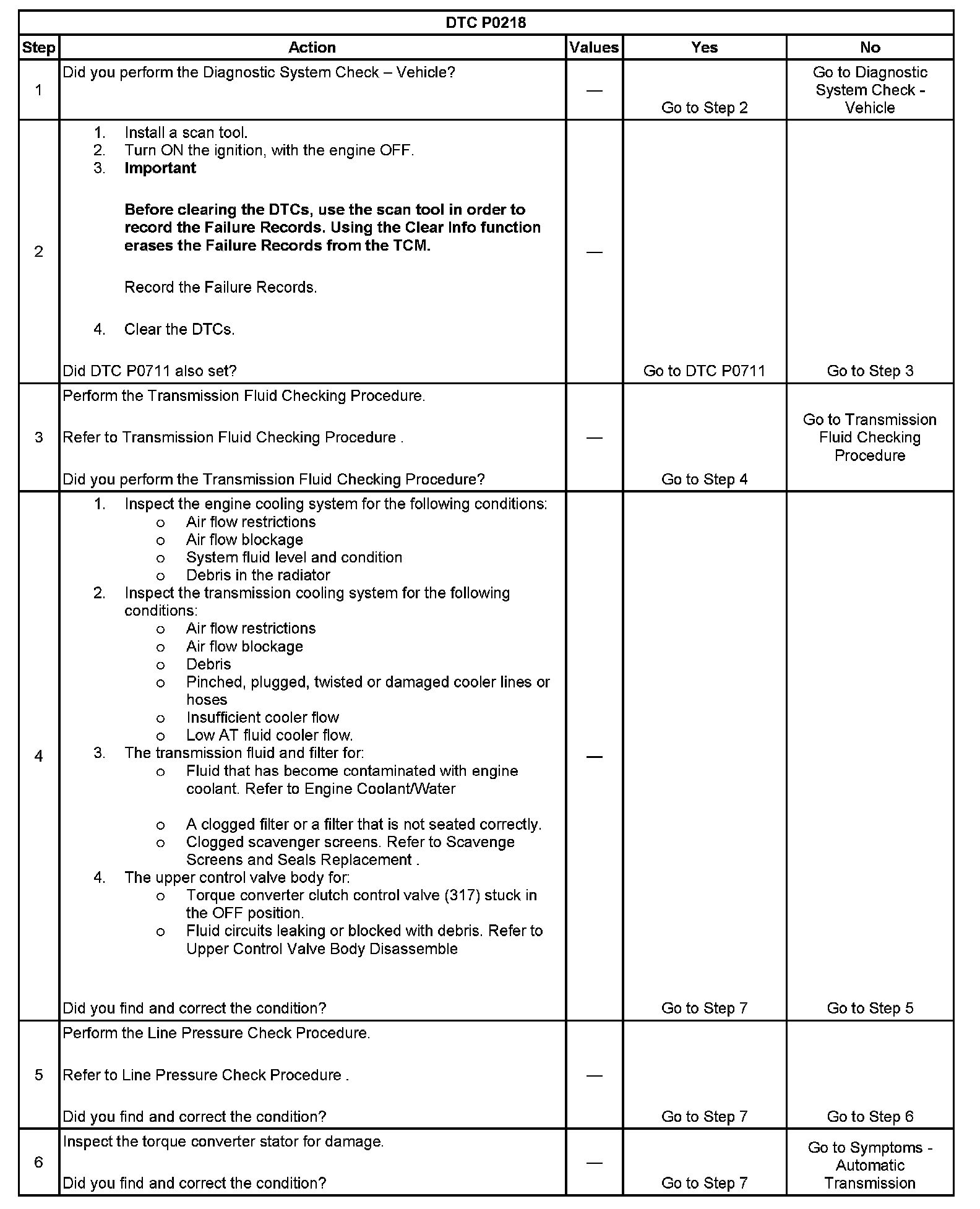 2. DTC P0218 may set approximately 60 seconds after DTC P0711 has set. Follow the diagnostic table for DTC P0711 before proceeding to the diagnostic table for DTC P0218. Repair of the condition that set DTC P0711 will likely eliminate DTC P0218.