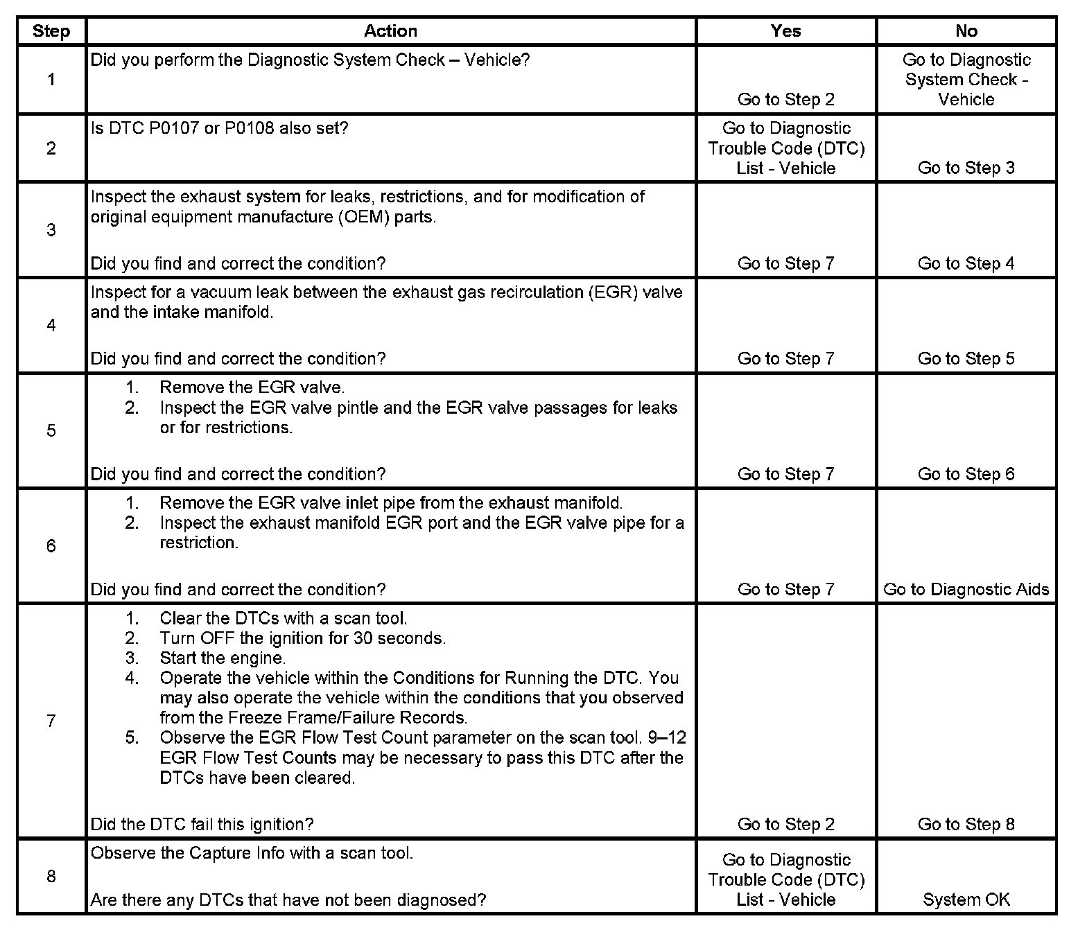 Normally, the ECM will only allow one EGR flow test during an ignition cycle. To aid in verifying a repair, the ECM will allow up to 27 EGR flow test counts during the first ignition cycle following a code clear event. Between 8-14 EGR flow test counts should be sufficient for the ECM to determine adequate EGR flow and pass the EGR flow test. If the ECM detects an EGR flow error, DTC P0401 sets.