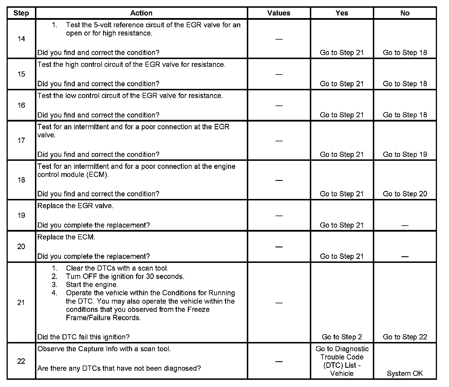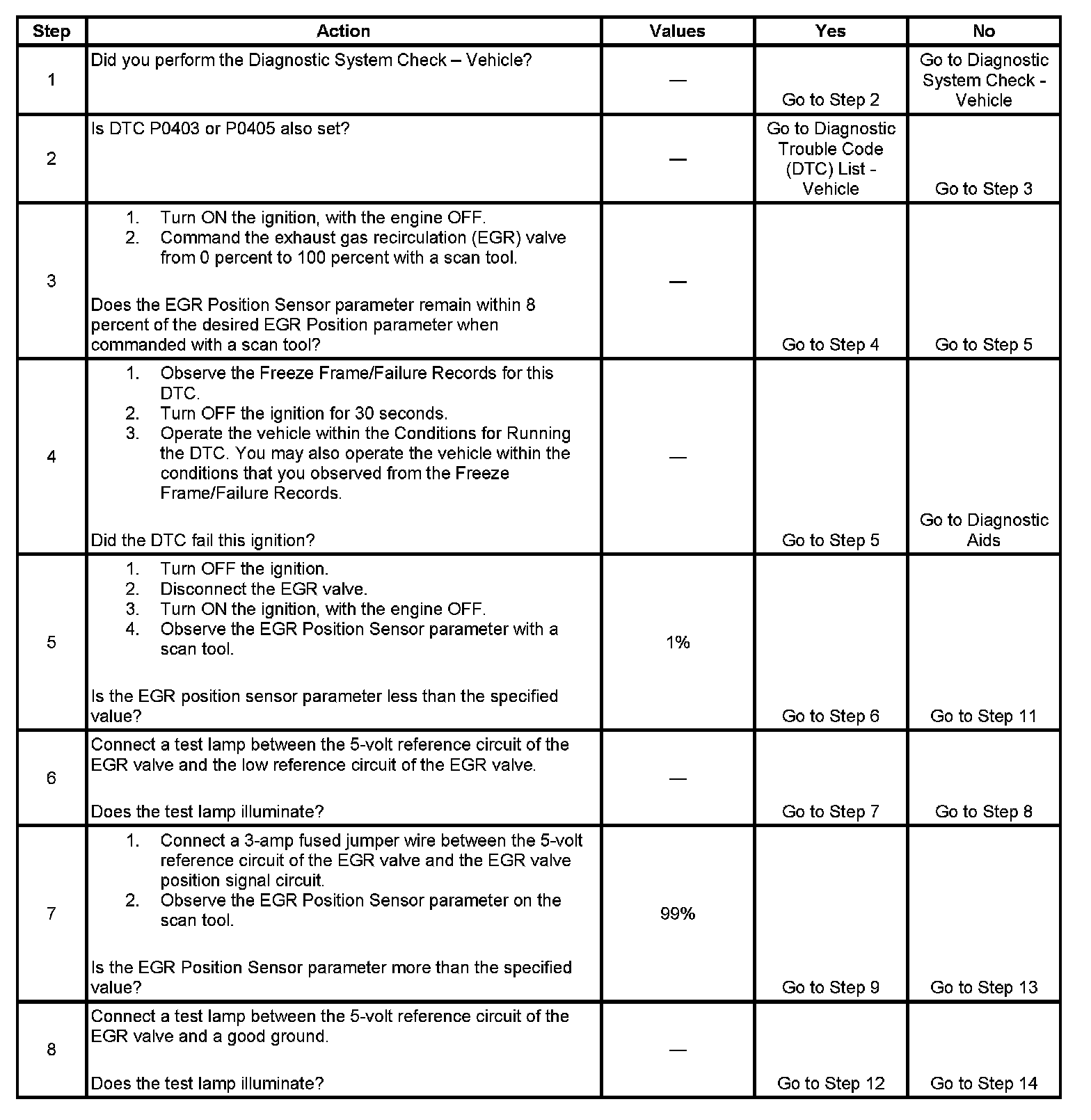 The exhaust gas recirculation (EGR) valve position sensor is monitored by the engine control module (ECM). The 5-Volt reference circuit, low reference circuit and the EGR valve position signal circuit are used by the ECM to determine the EGR valve position. The ECM compares the EGR Position Sensor parameter with the Desired EGR Position parameter when the valve is commanded open or closed. If the ECM detects a calibrated difference between the EGR Position Sensor parameter and Desired EGR Position parameter for a calibrated amount of time, DTC P0404 sets.