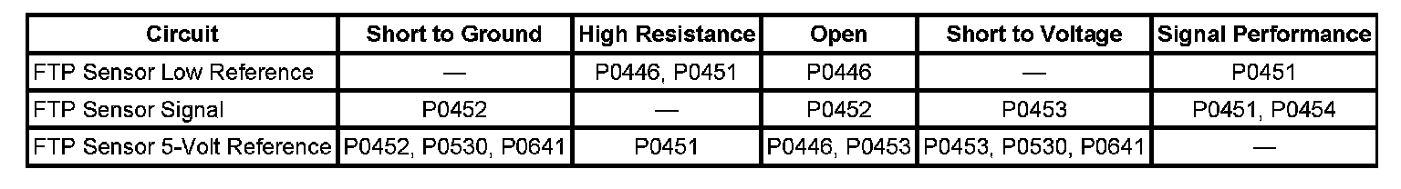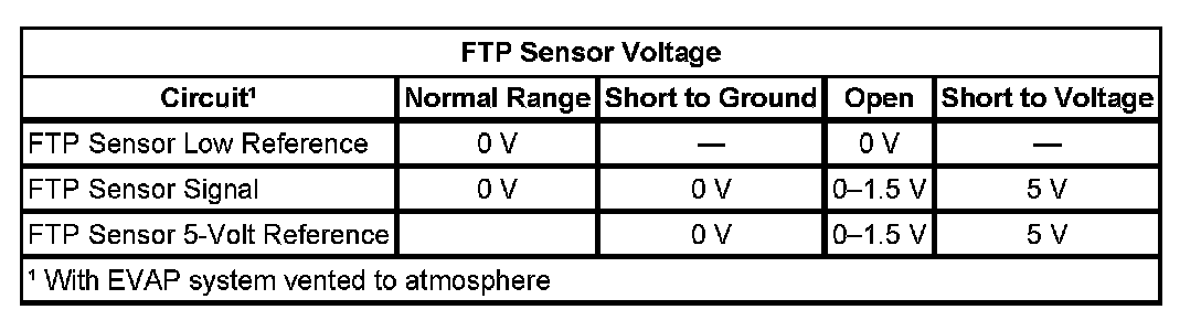 The fuel tank pressure (FTP) sensor measures air pressure or vacuum in the evaporative emission (EVAP) system. The control module supplies a 5-Volt reference and a low reference circuit to the FTP sensor. The FTP sensor signal voltage varies depending on EVAP system pressure or vacuum. The controller also uses this FTP signal to determine atmospheric pressure for use in the engine-off small leak test, DTC P0442. Before using this signal as an atmospheric reference it must first be re-zeroed.
