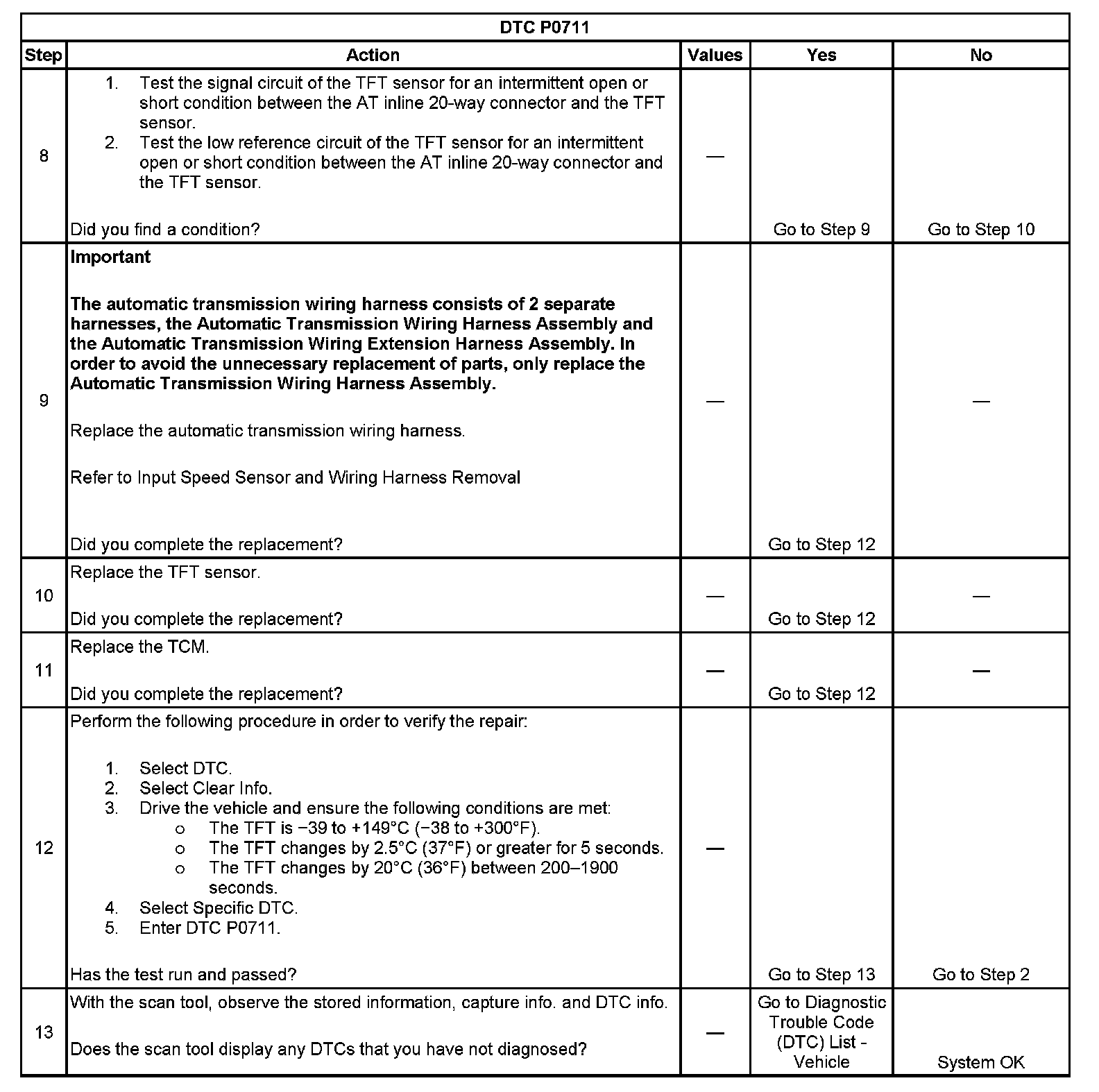 If the transmission control module (TCM) detects an intermittent voltage or no voltage change in the TFT sensor circuit, then DTC P0711 sets. DTC P0711 is a type C DTC.