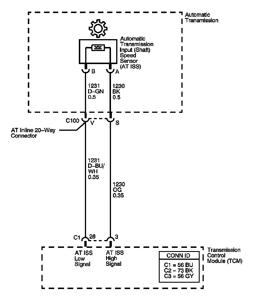 The automatic transmission input shaft speed sensor (AT ISS) is a permanent magnet generator. The AT ISS mounts in the transmission case facing the drive sprocket of the input shaft. As the drive sprocket rotates, an AC voltage is induced and transmitted to the transmission control module (TCM). The TCM converts the AC voltage into a digital signal. The TCM uses the input shaft speed signal to determine shift timing, torque converter clutch slip speed and gear ratio.